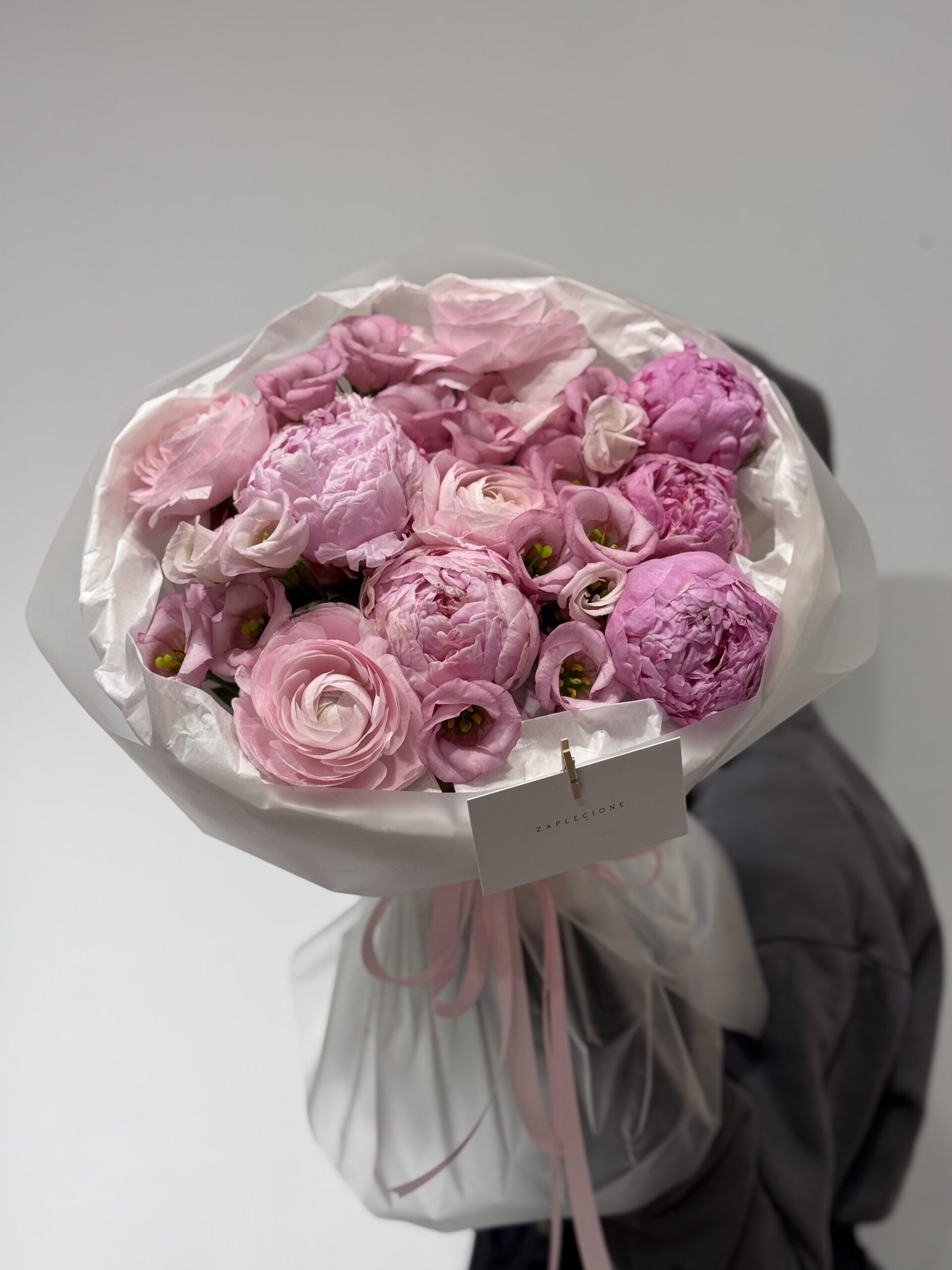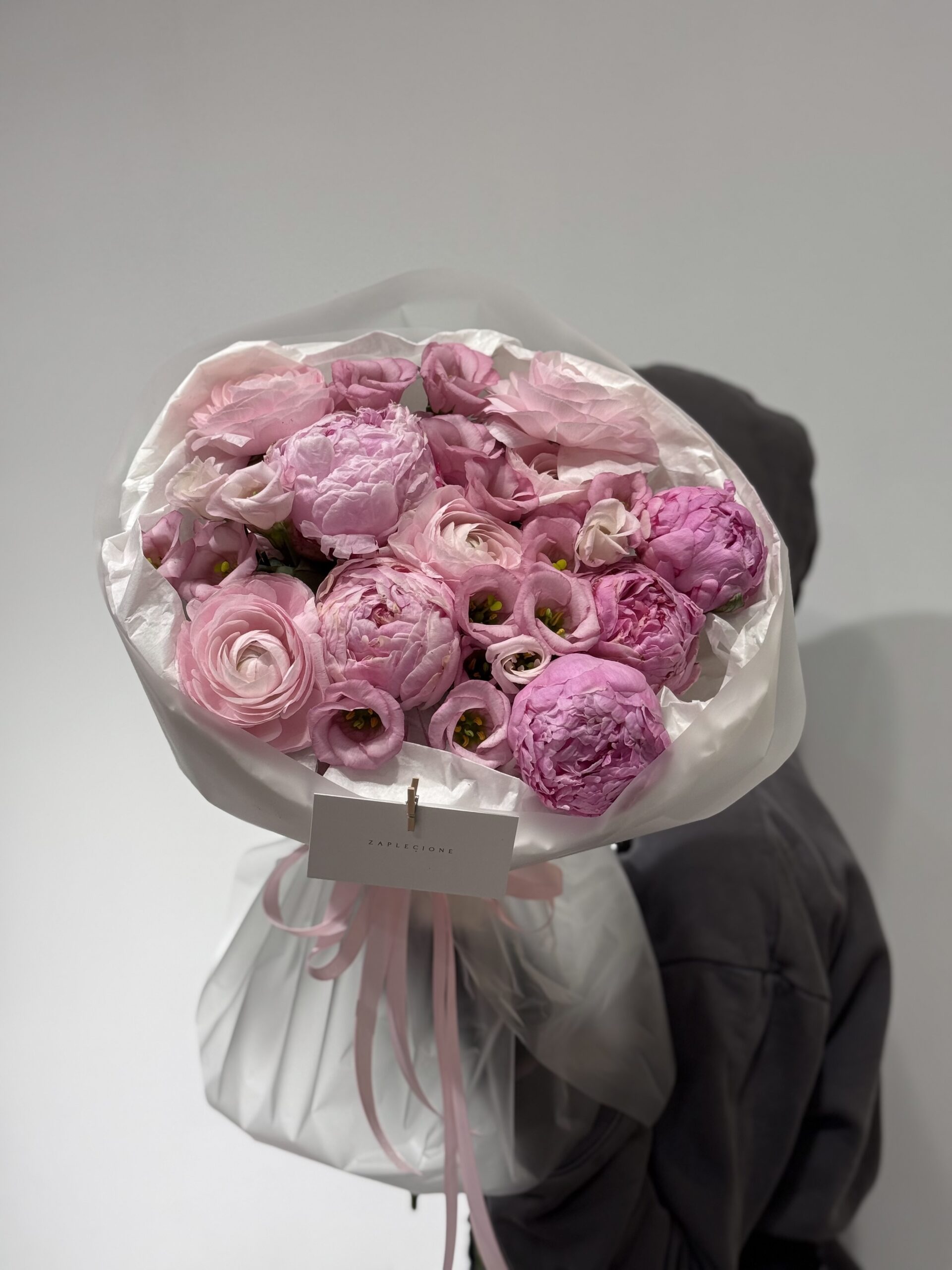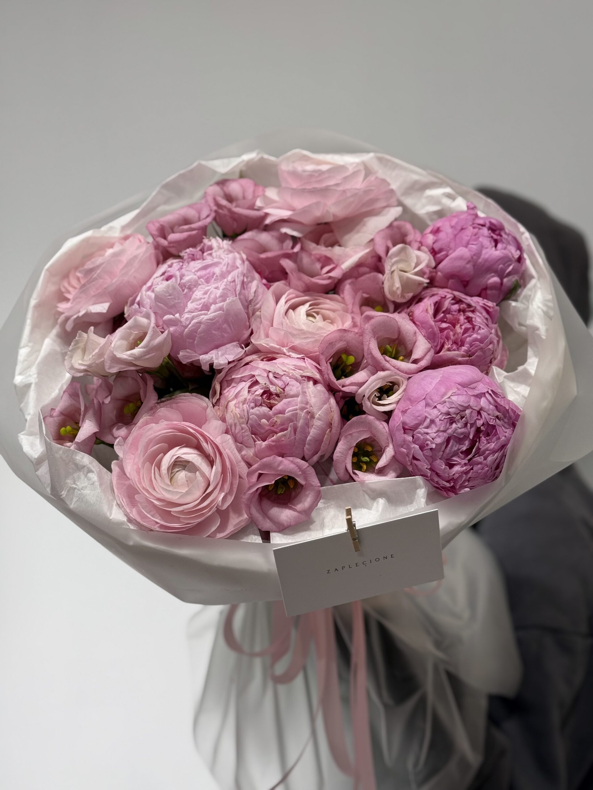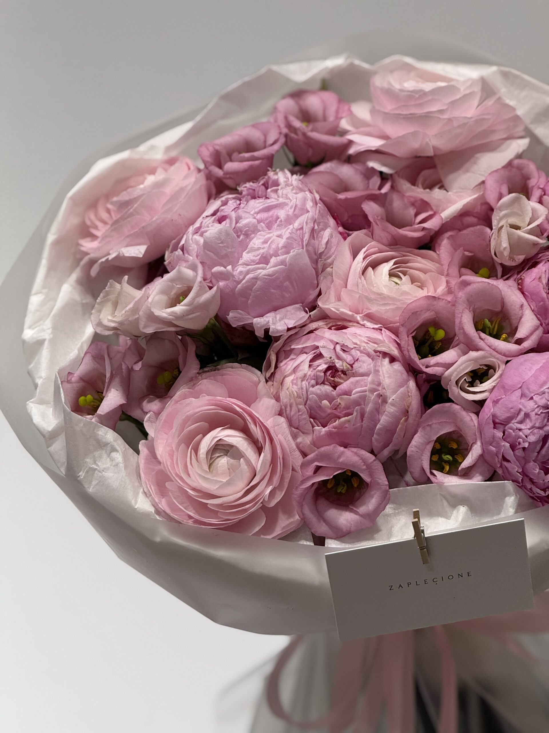 - Skład bukietu: piwonie, eustoma, ranunkulus.