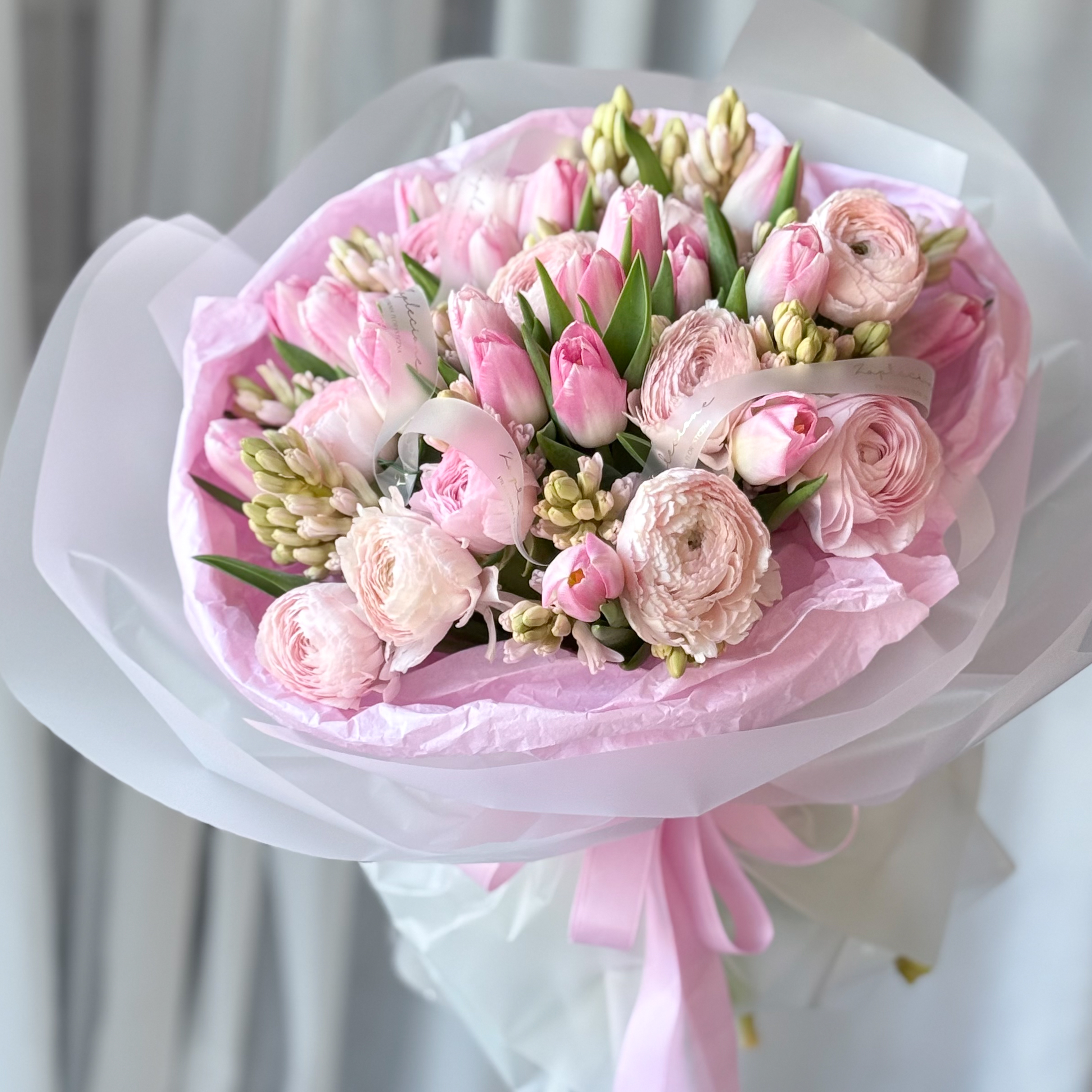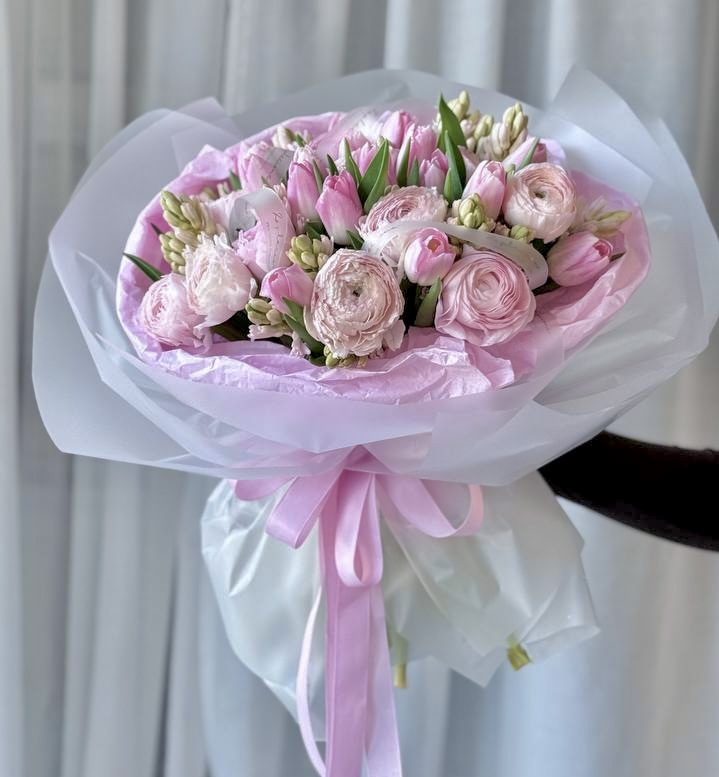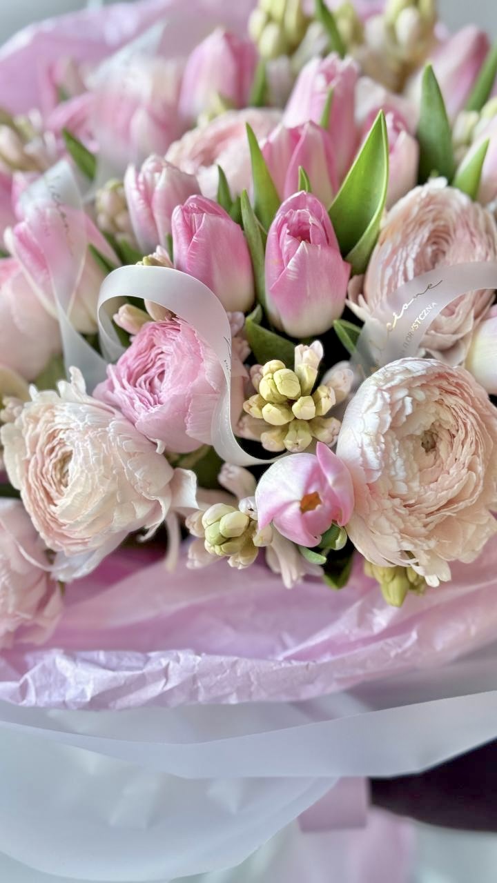 Liora to bukiet w delikatnych odcieniach różu, stworzony z ranunkulusów, tulipanów i hiacyntów.