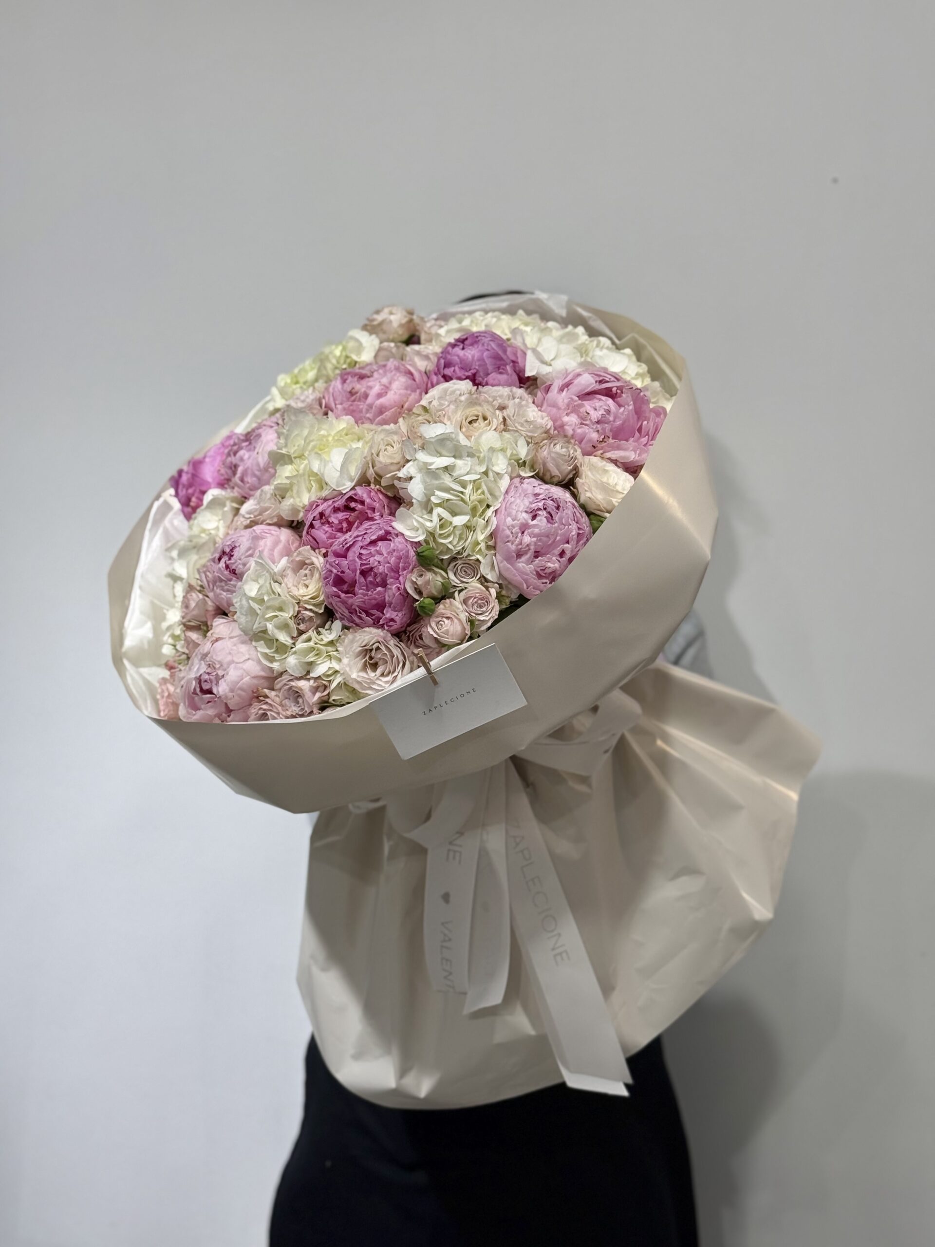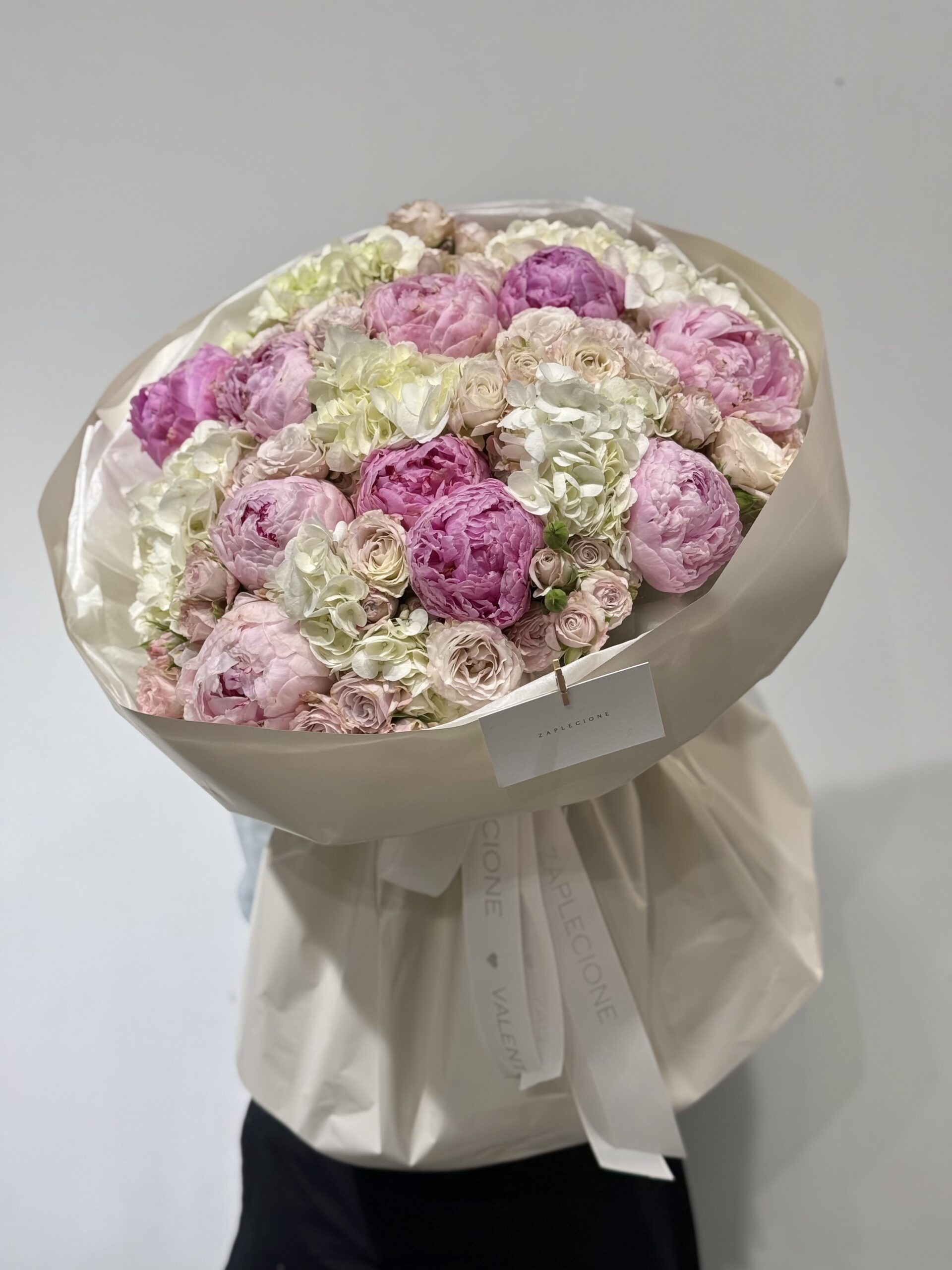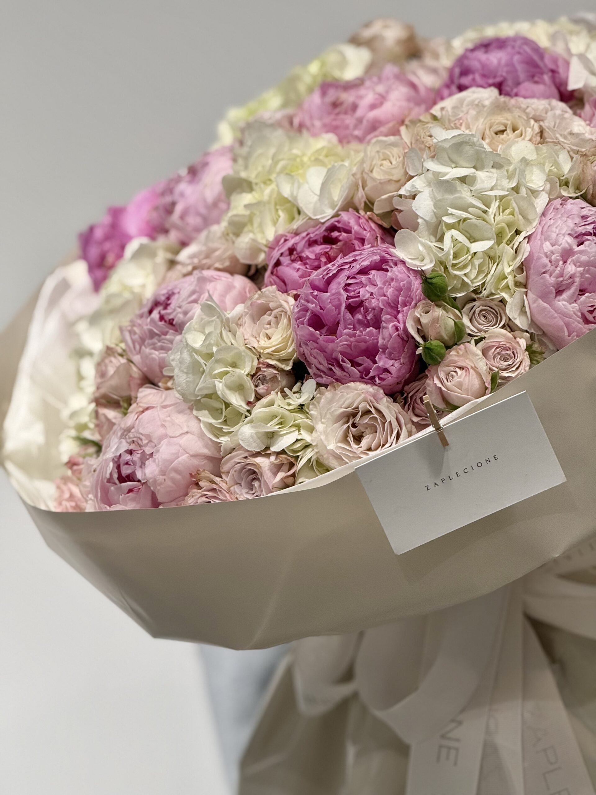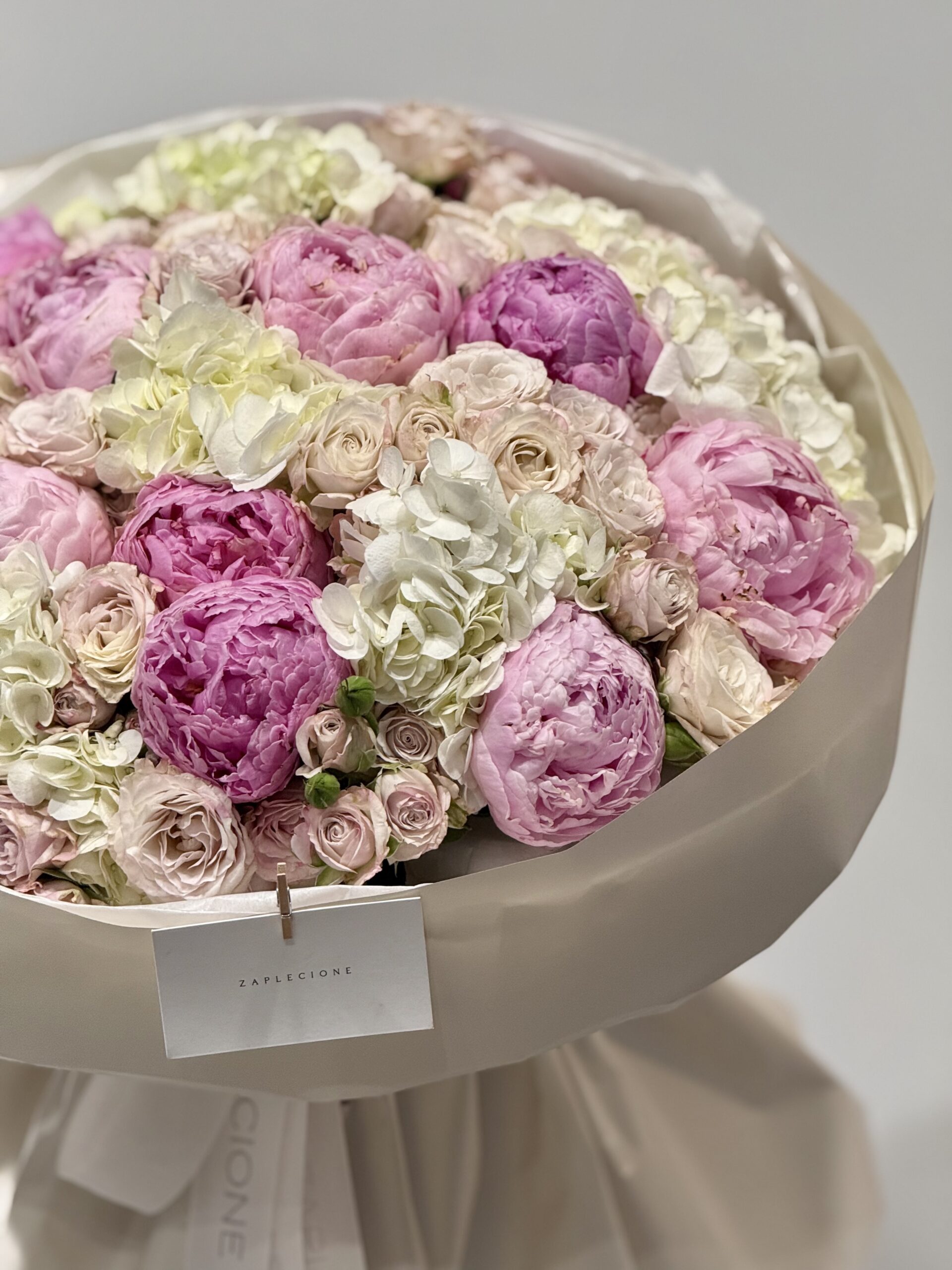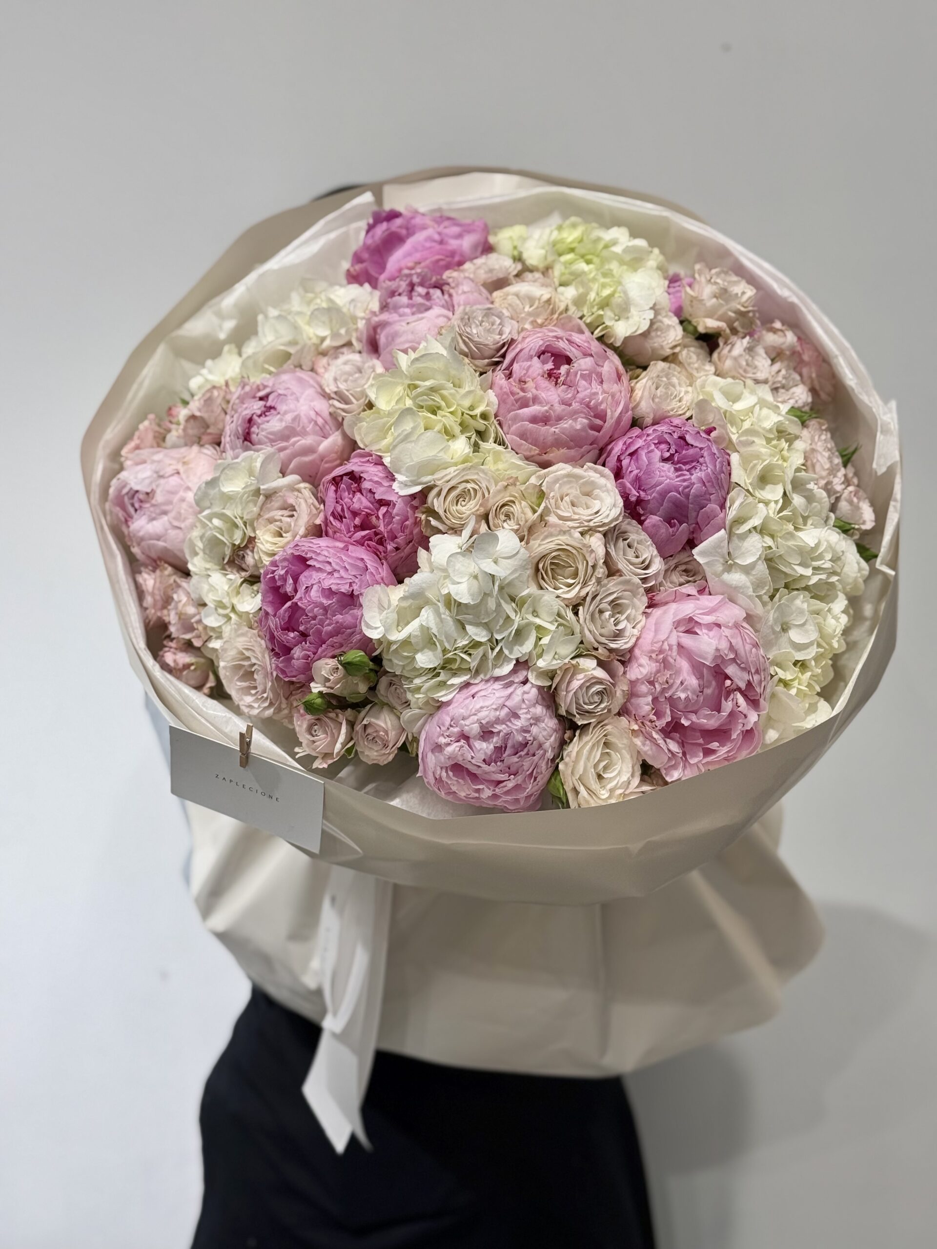 - Skład bukietu: hortensja, piwonie, ozothamus, róże gałązkowe.