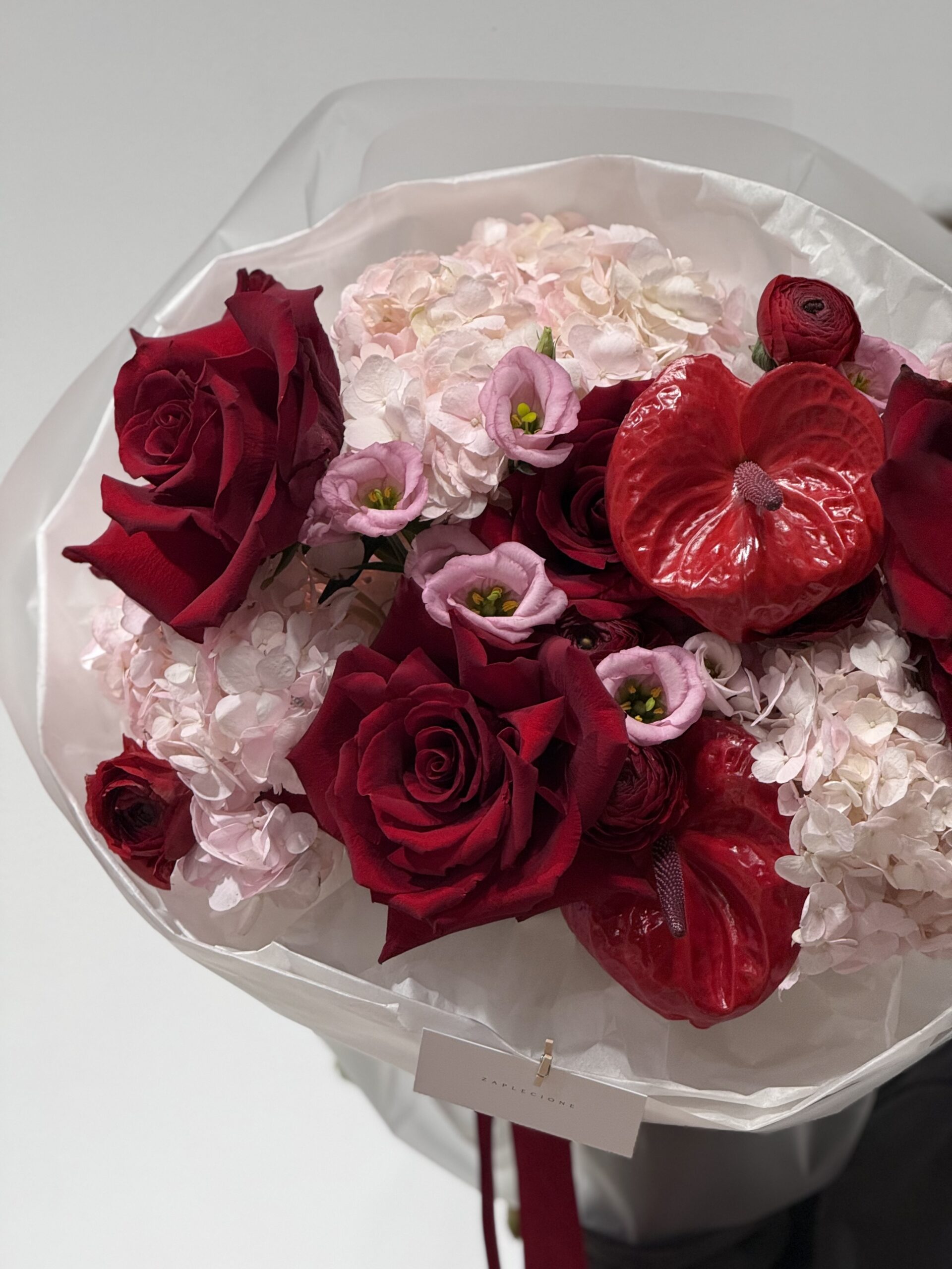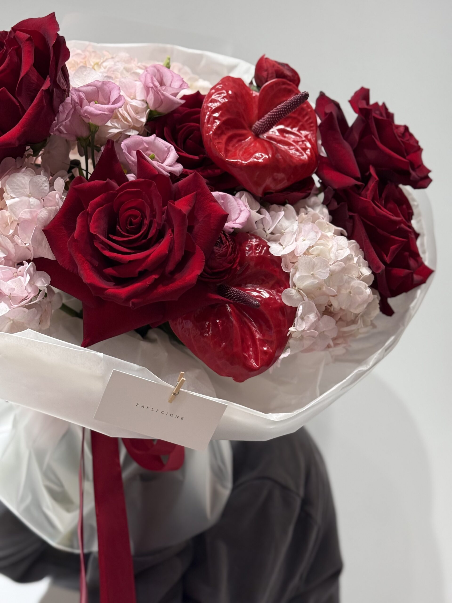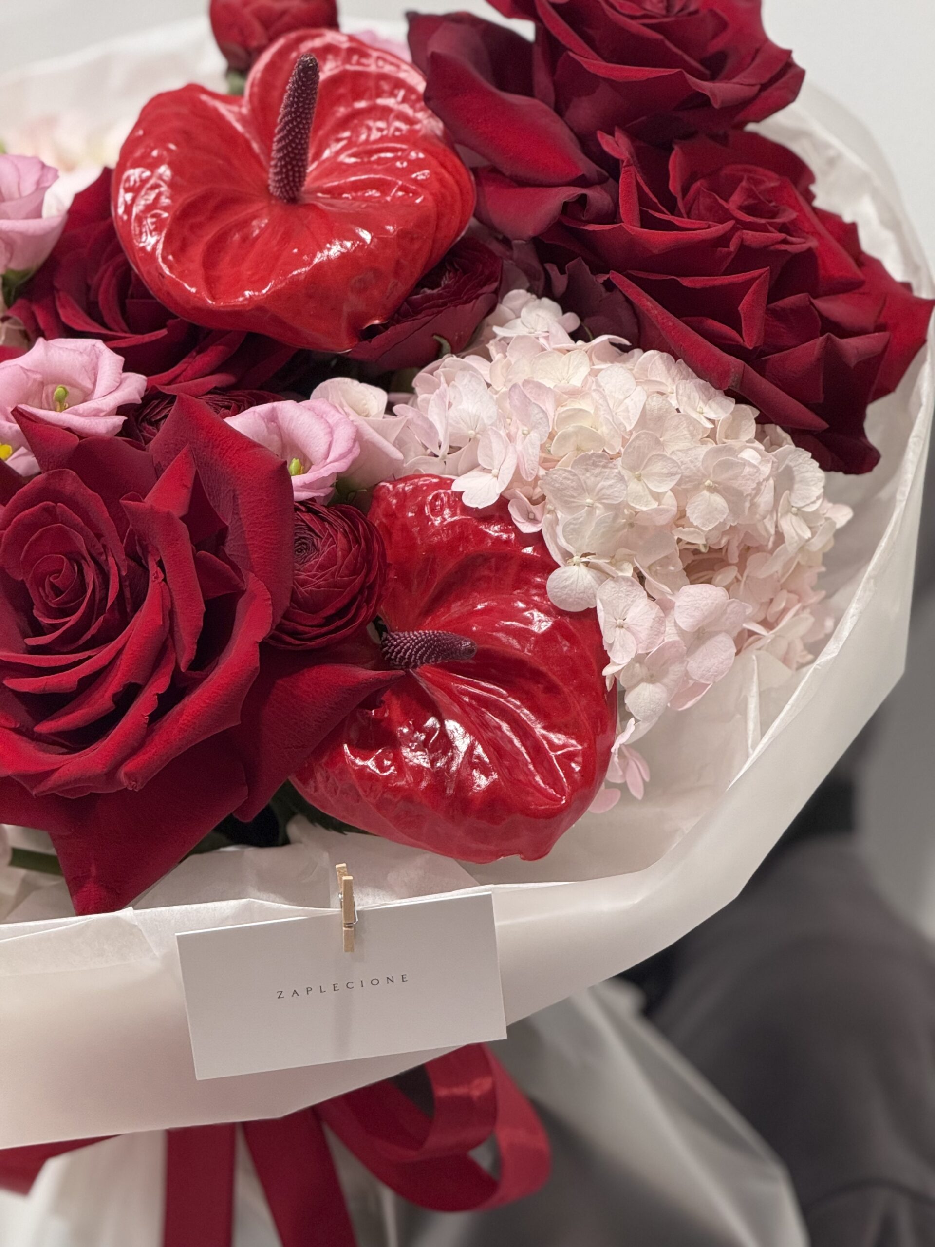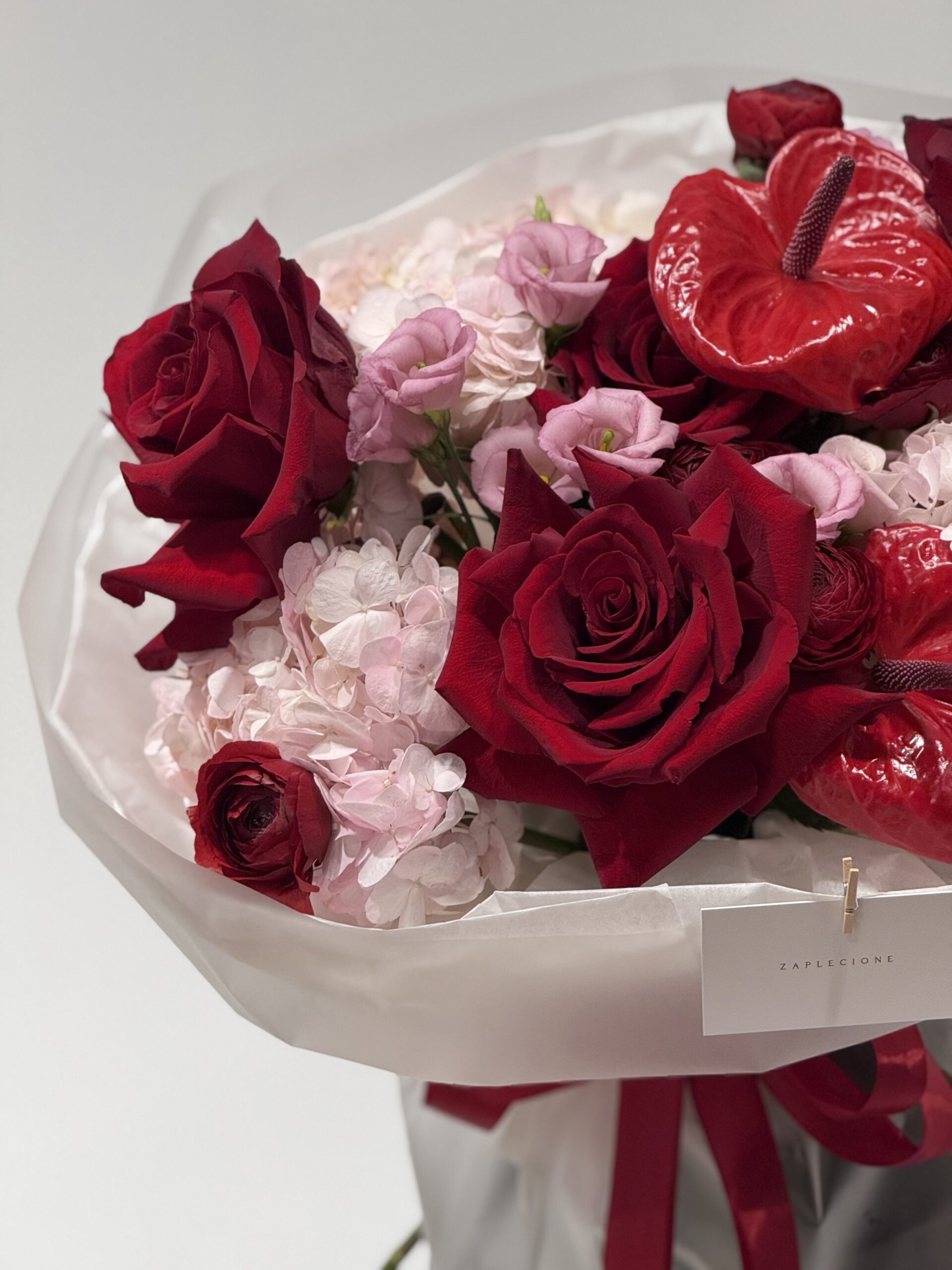 - Skład bukietu: hortensja, róże, anturium, eustoma, ranunkulus.