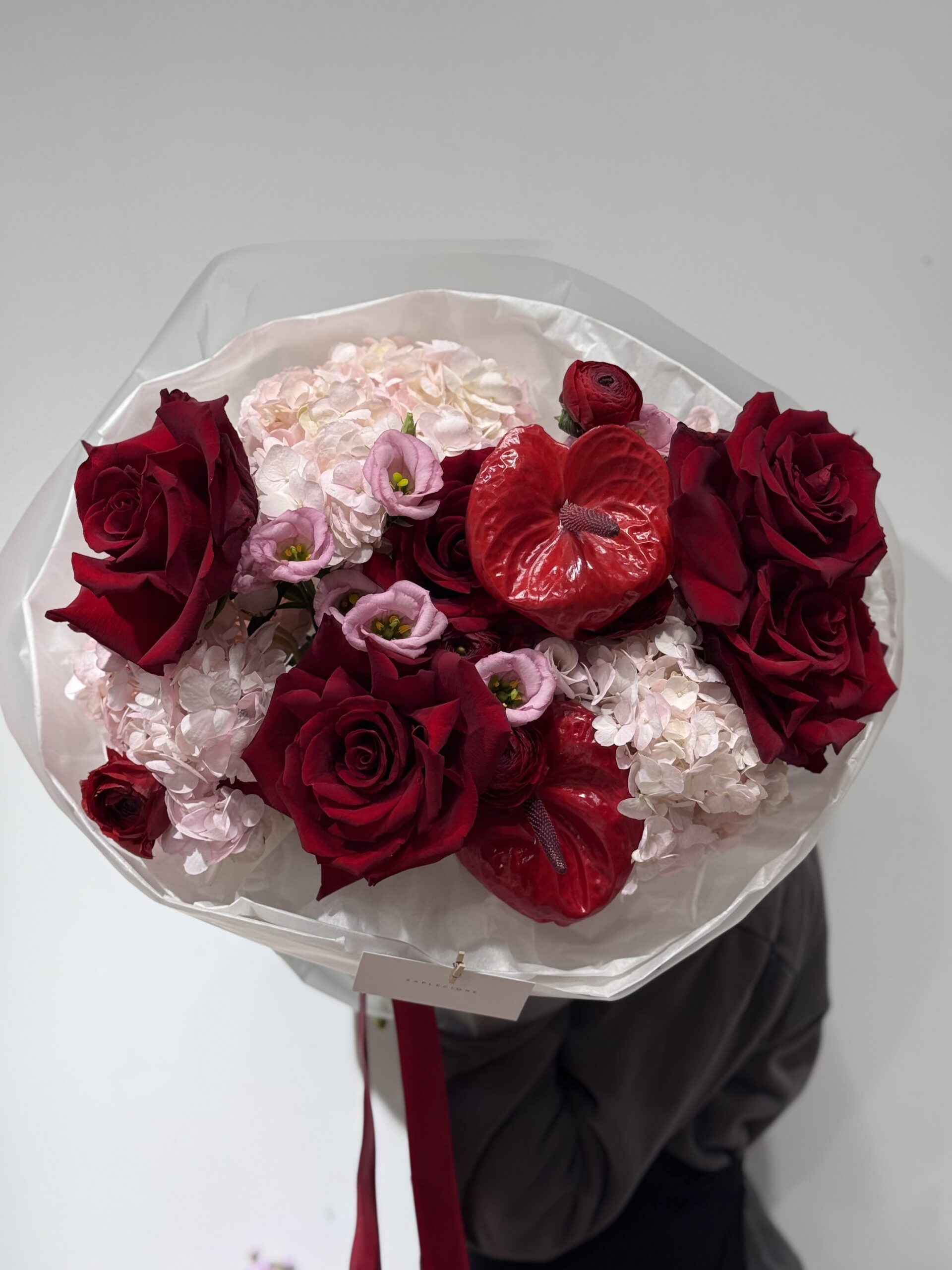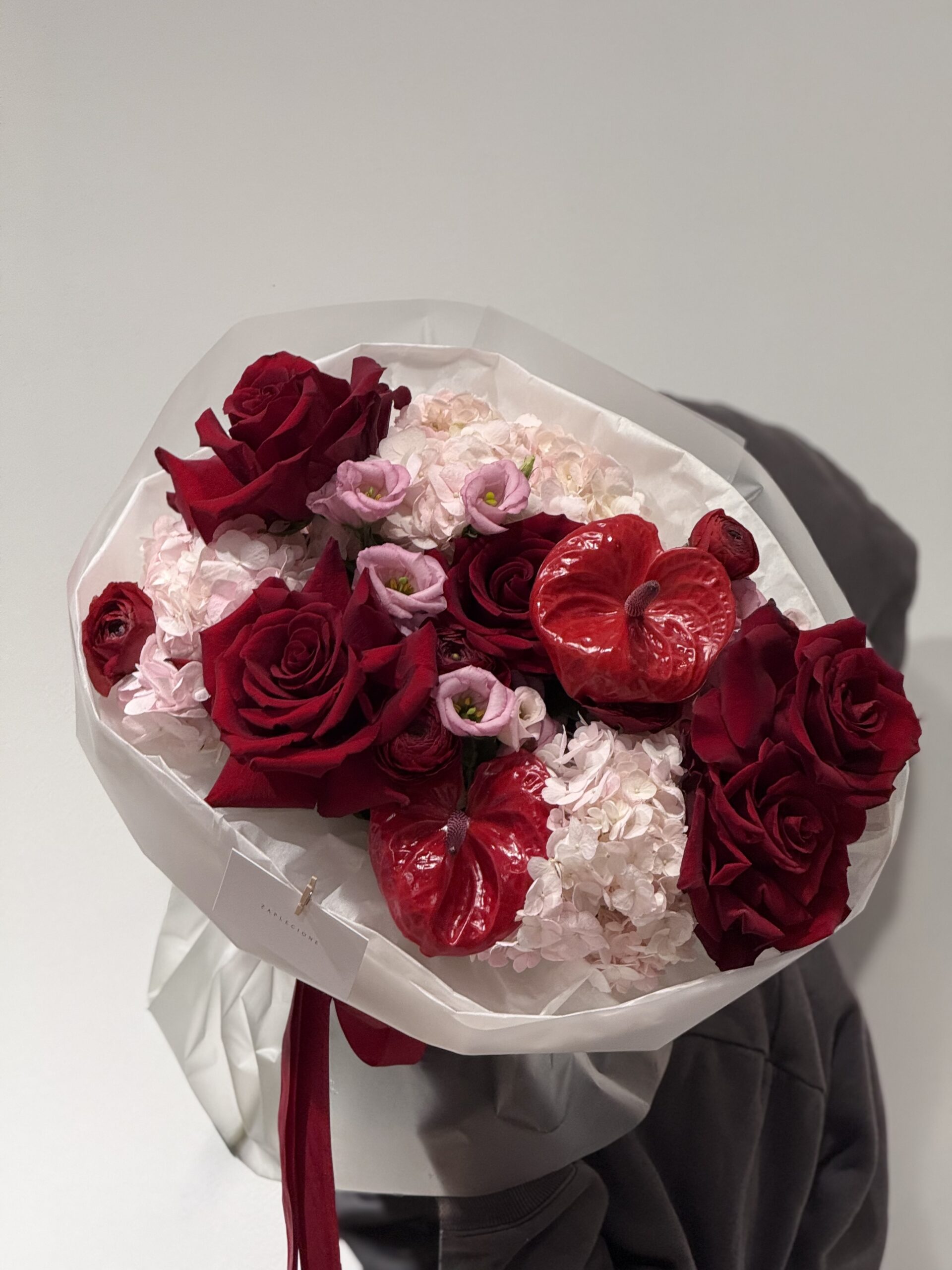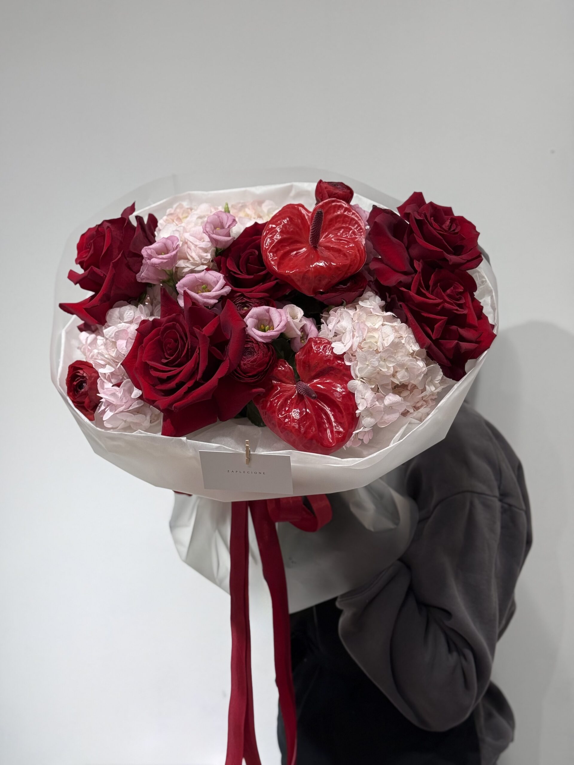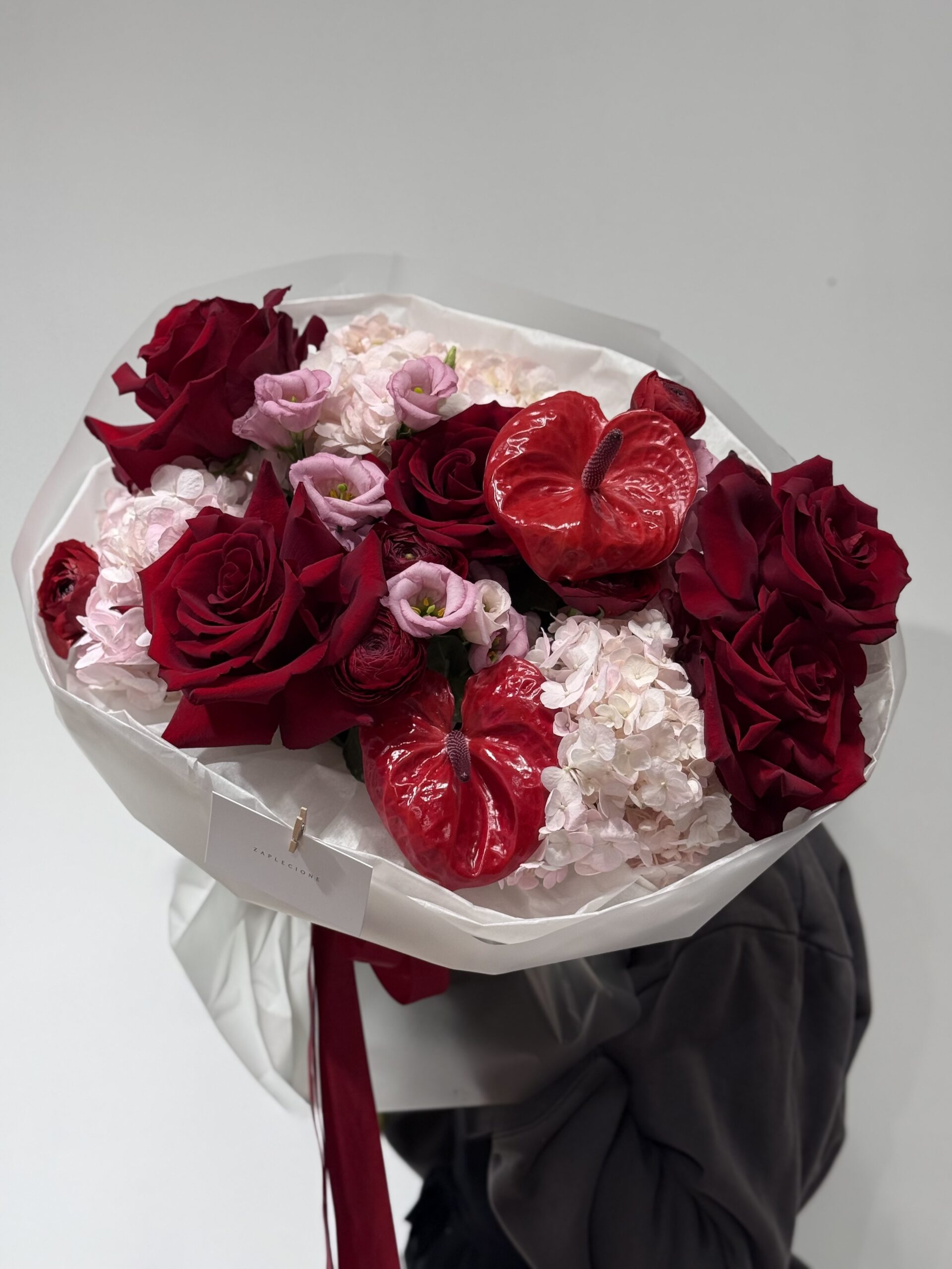 - Skład bukietu: hortensja, róże, anturium, eustoma, ranunkulus.