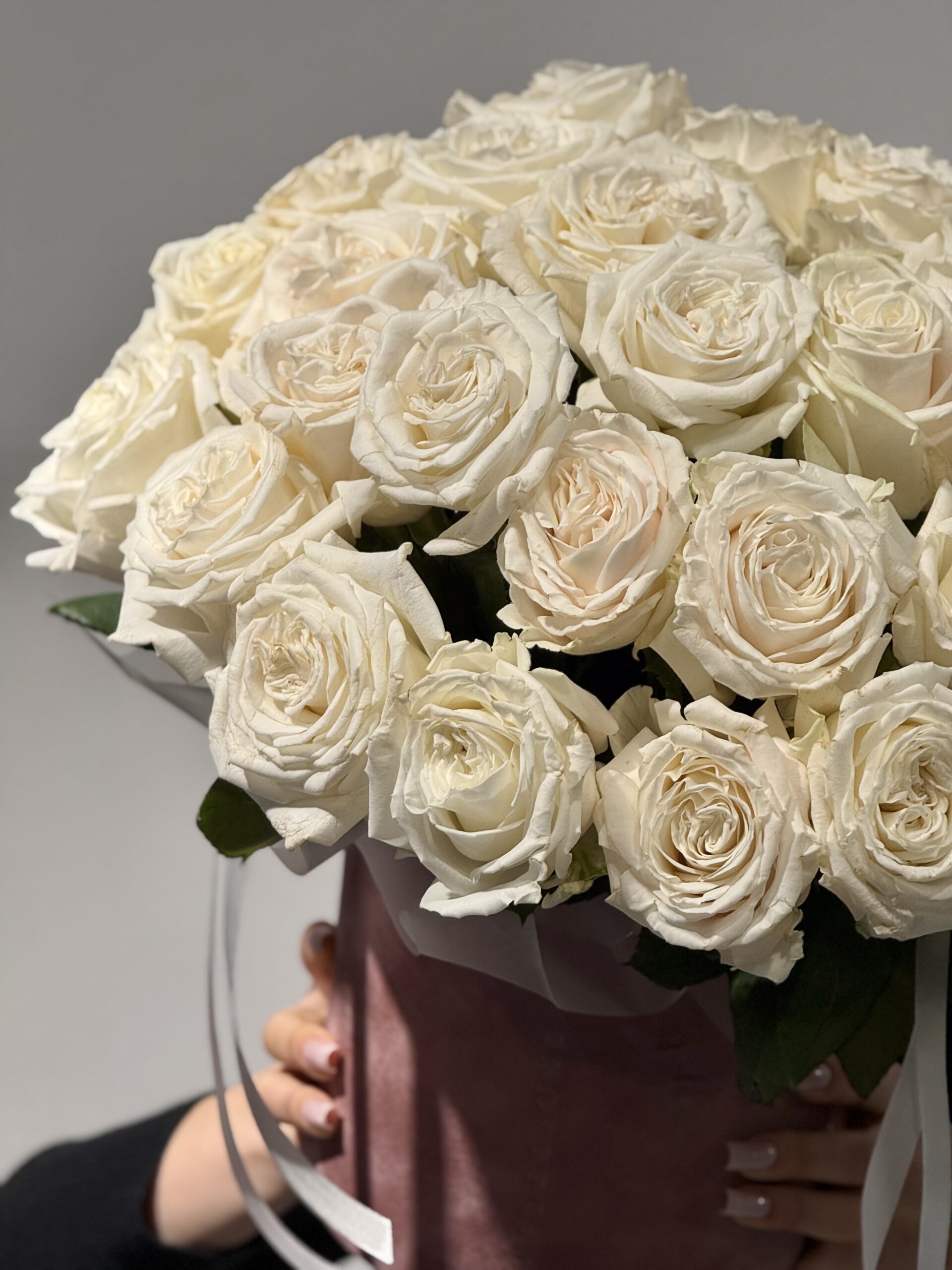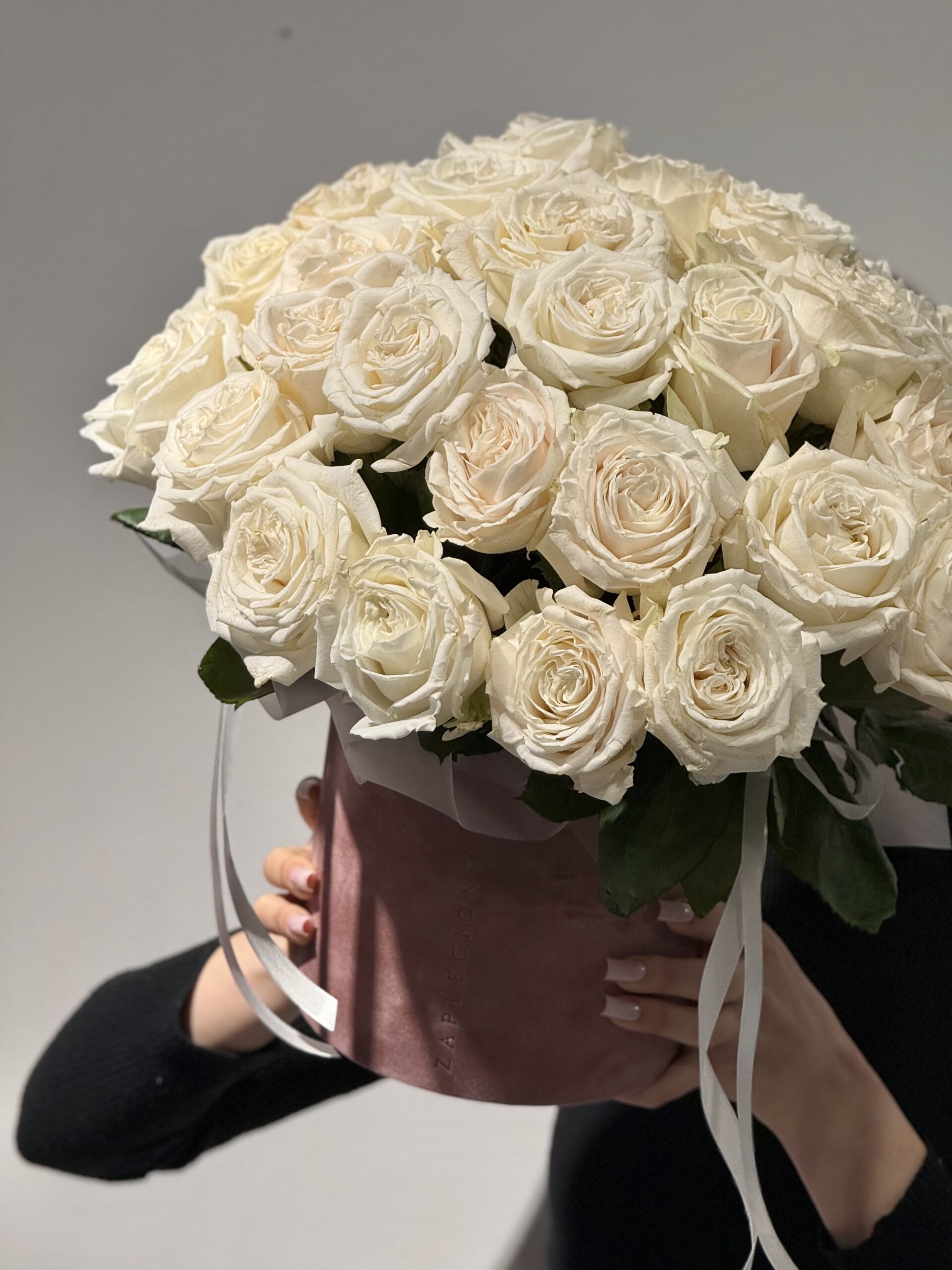 białych róż klasy premium, ułożonych w eleganckim flower boxie.