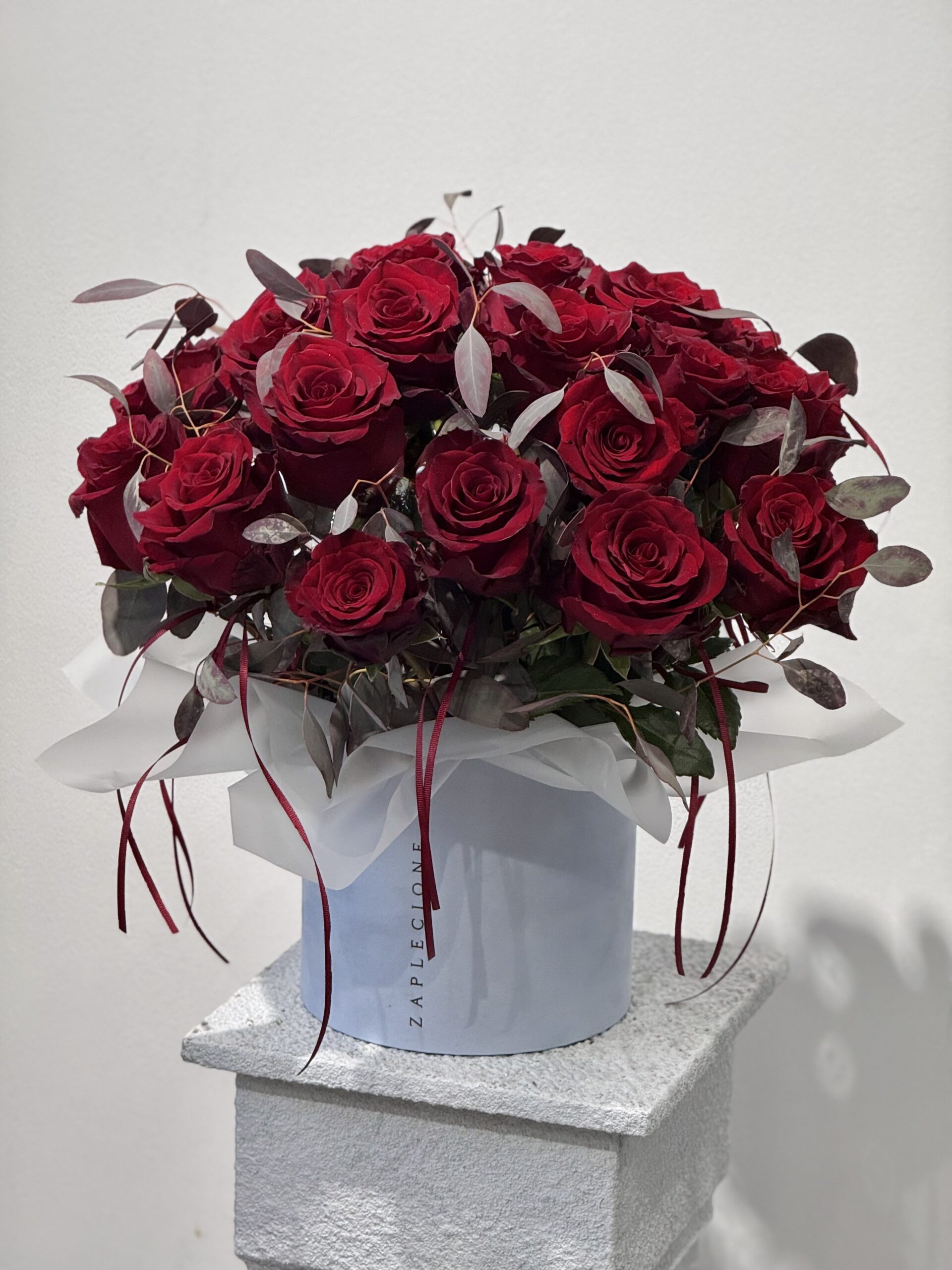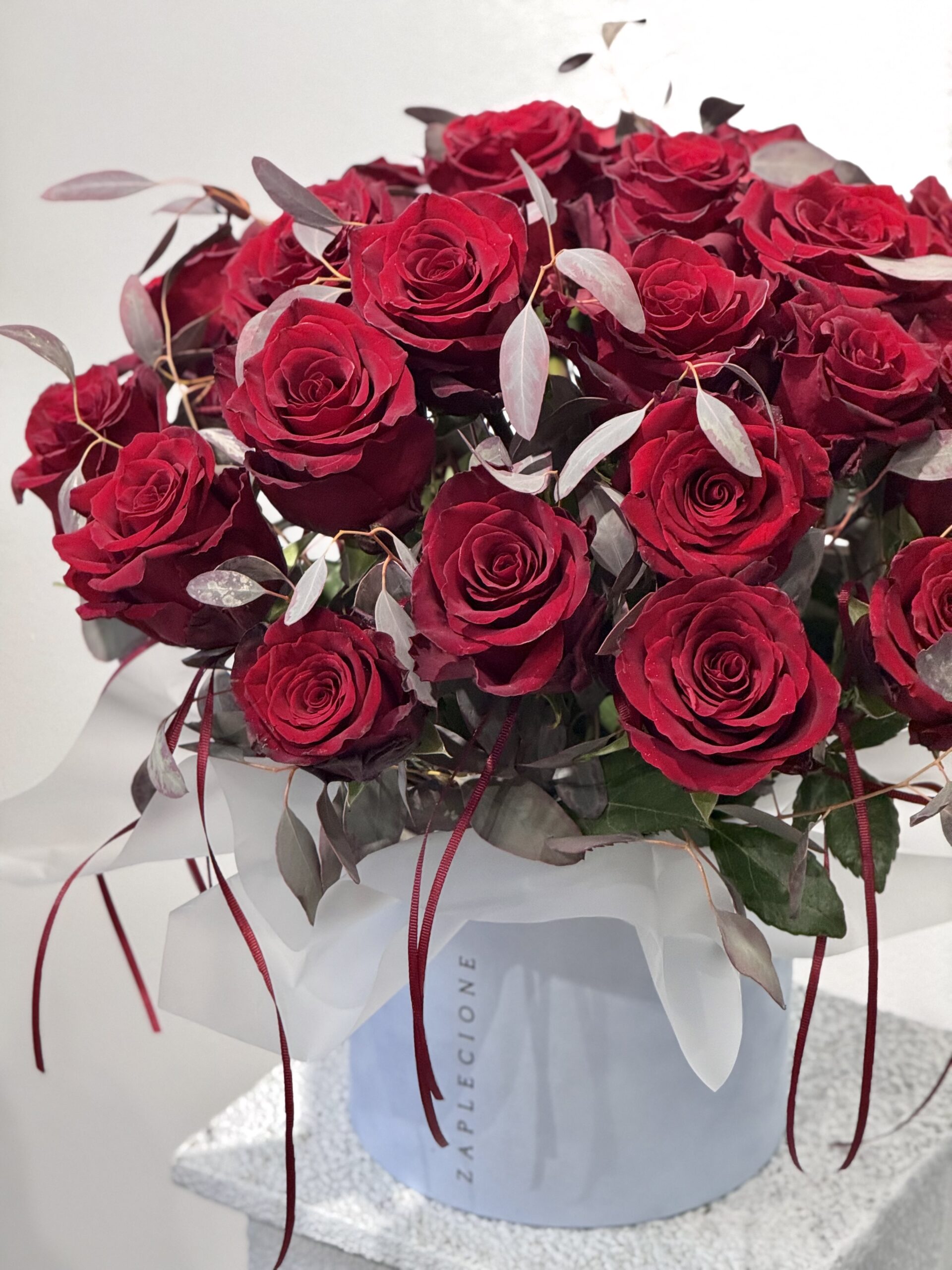 intensywnie czerwonych róż klasy premium oraz świeżego eukaliptusa,