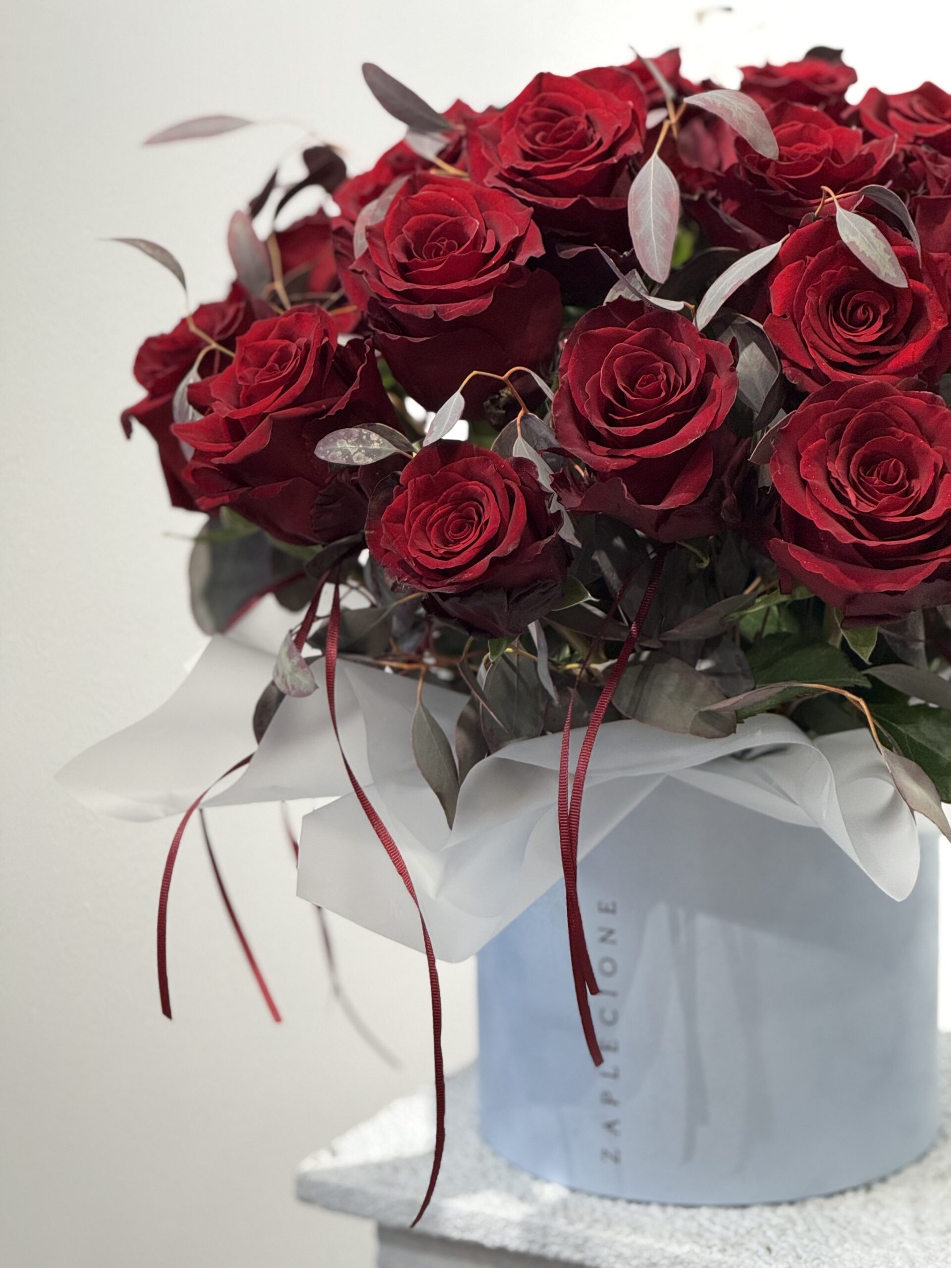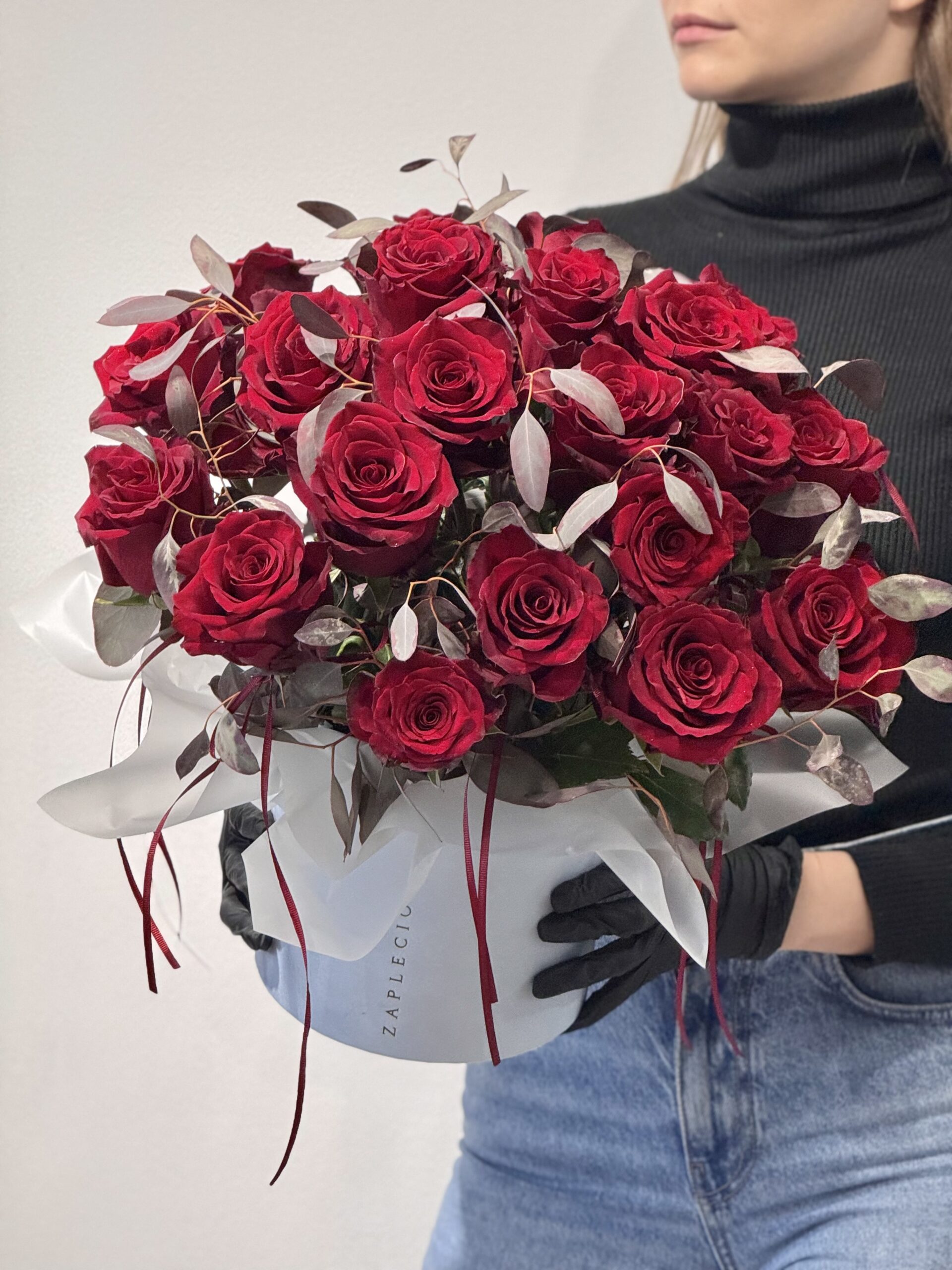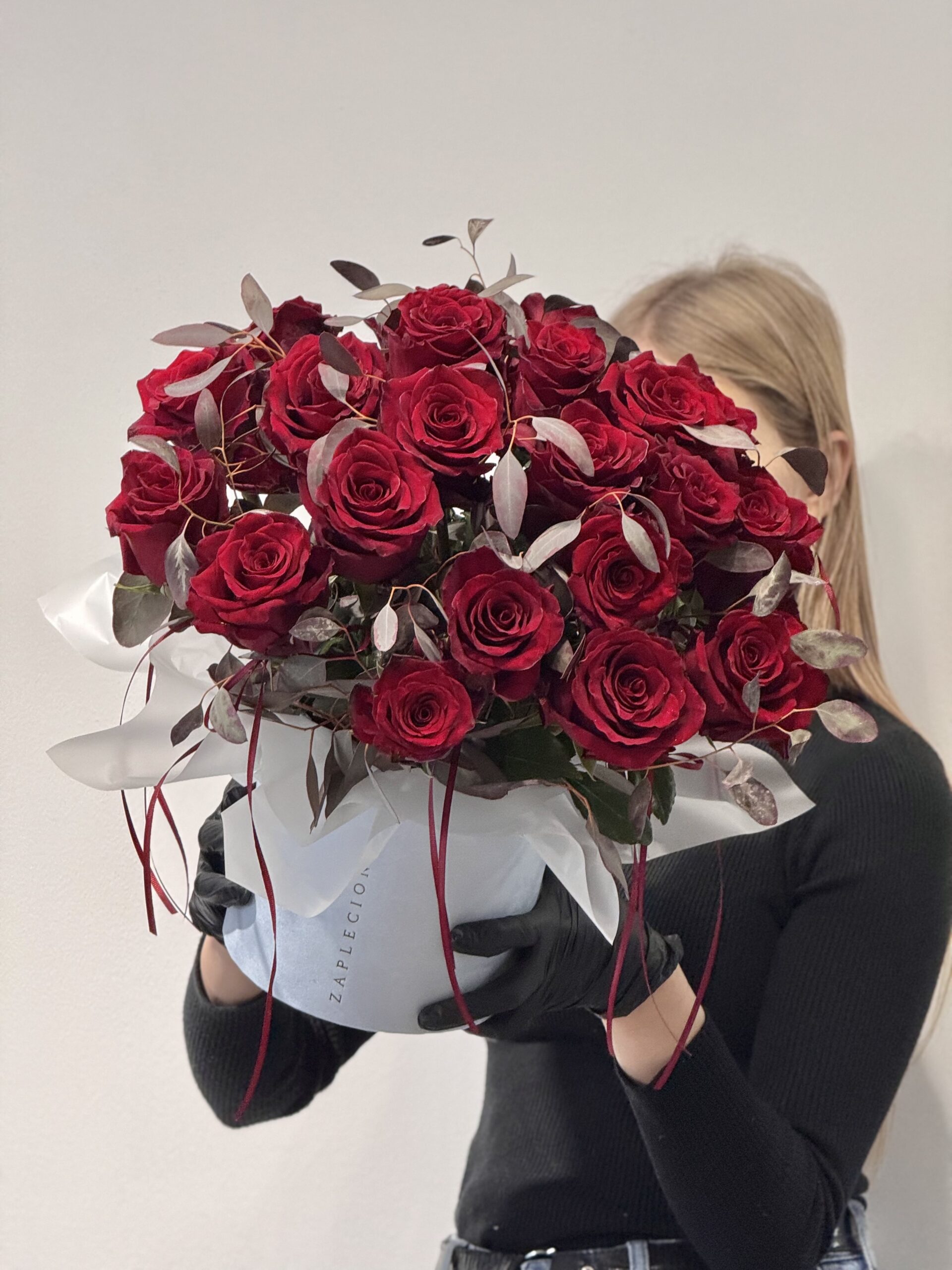 - Skład: czerwone róże klasy premium, eukaliptus.