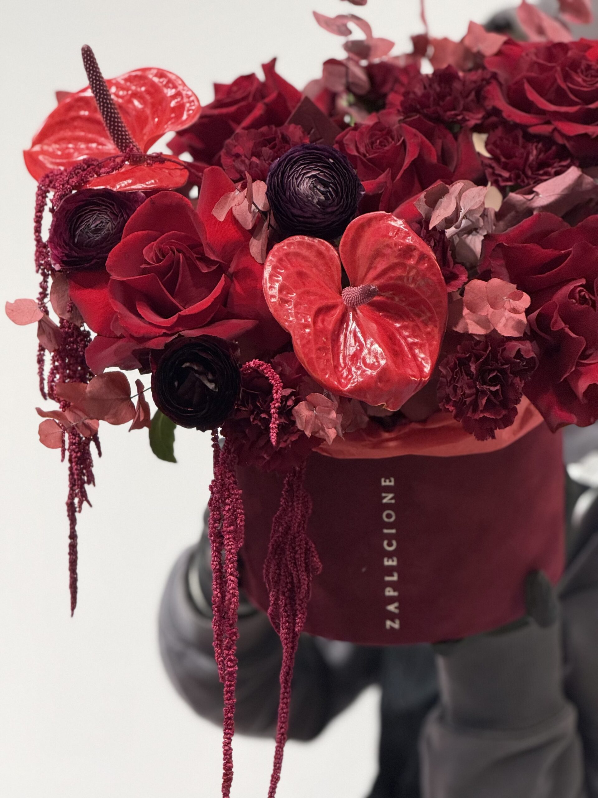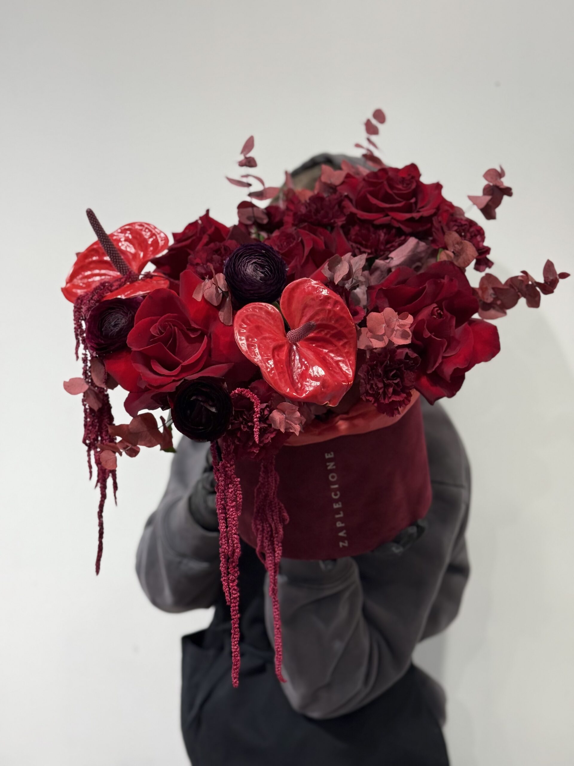 - Skład: czerwone róże, anturium, jaskry, goździki, eukaliptus.