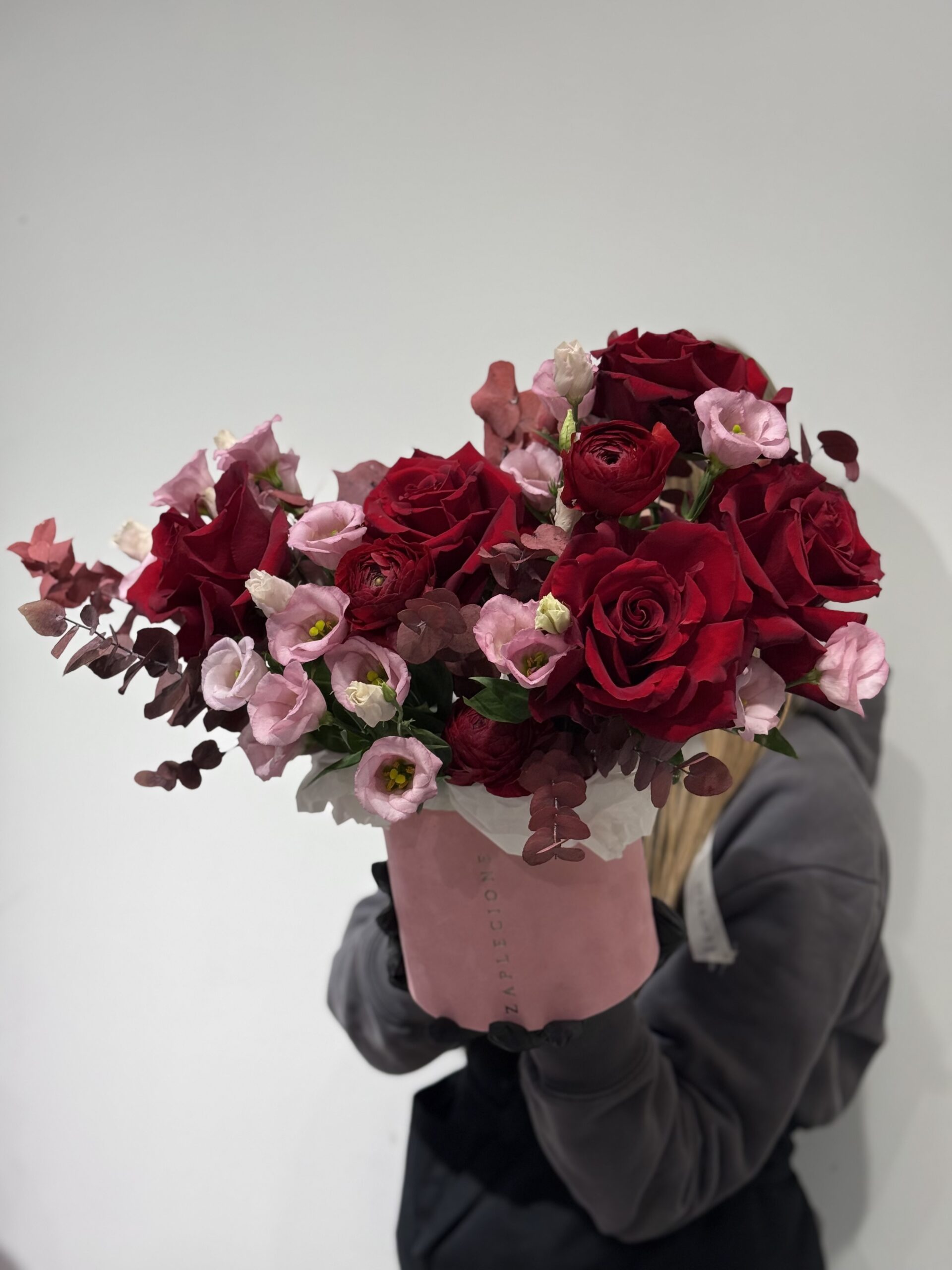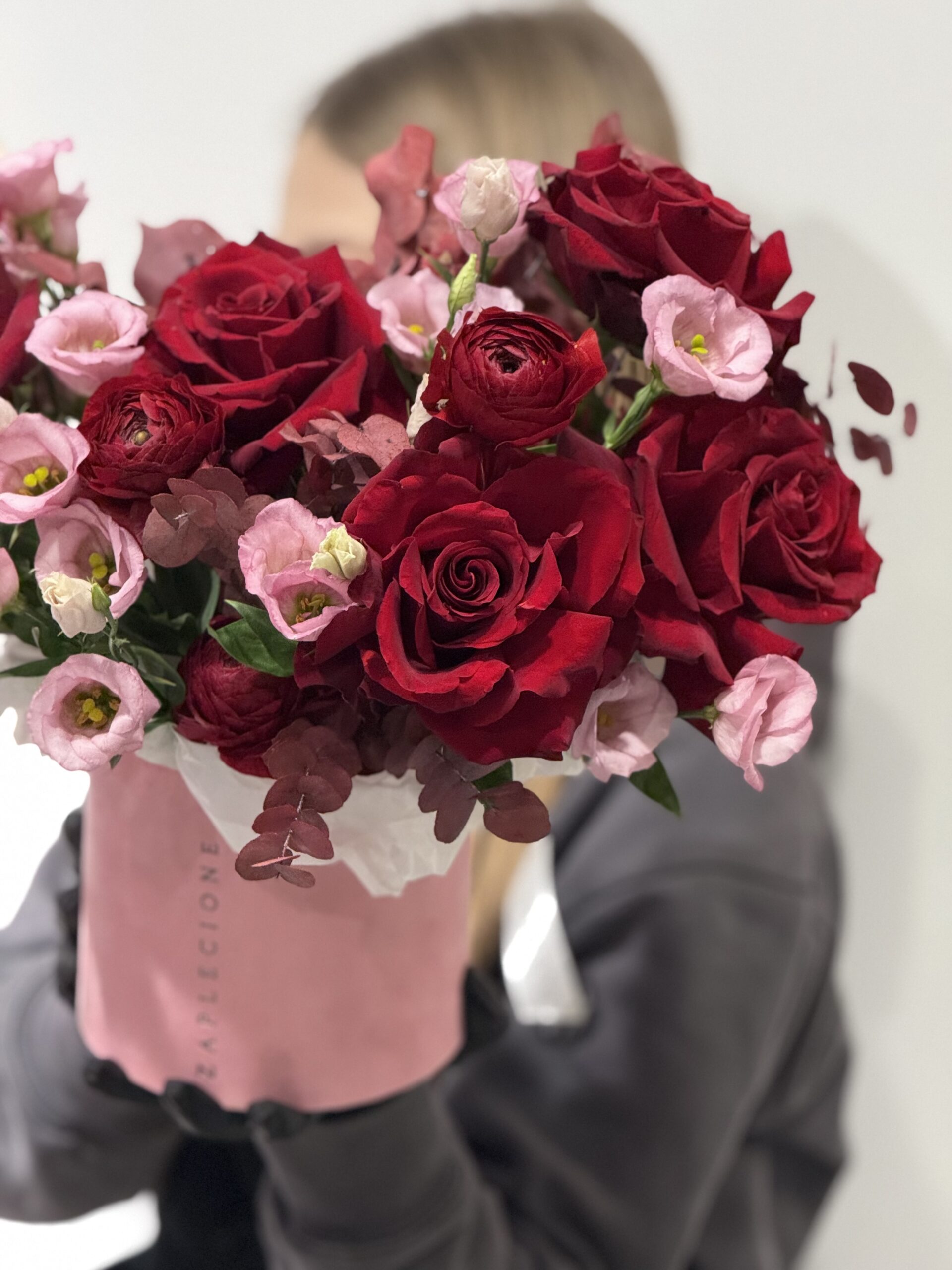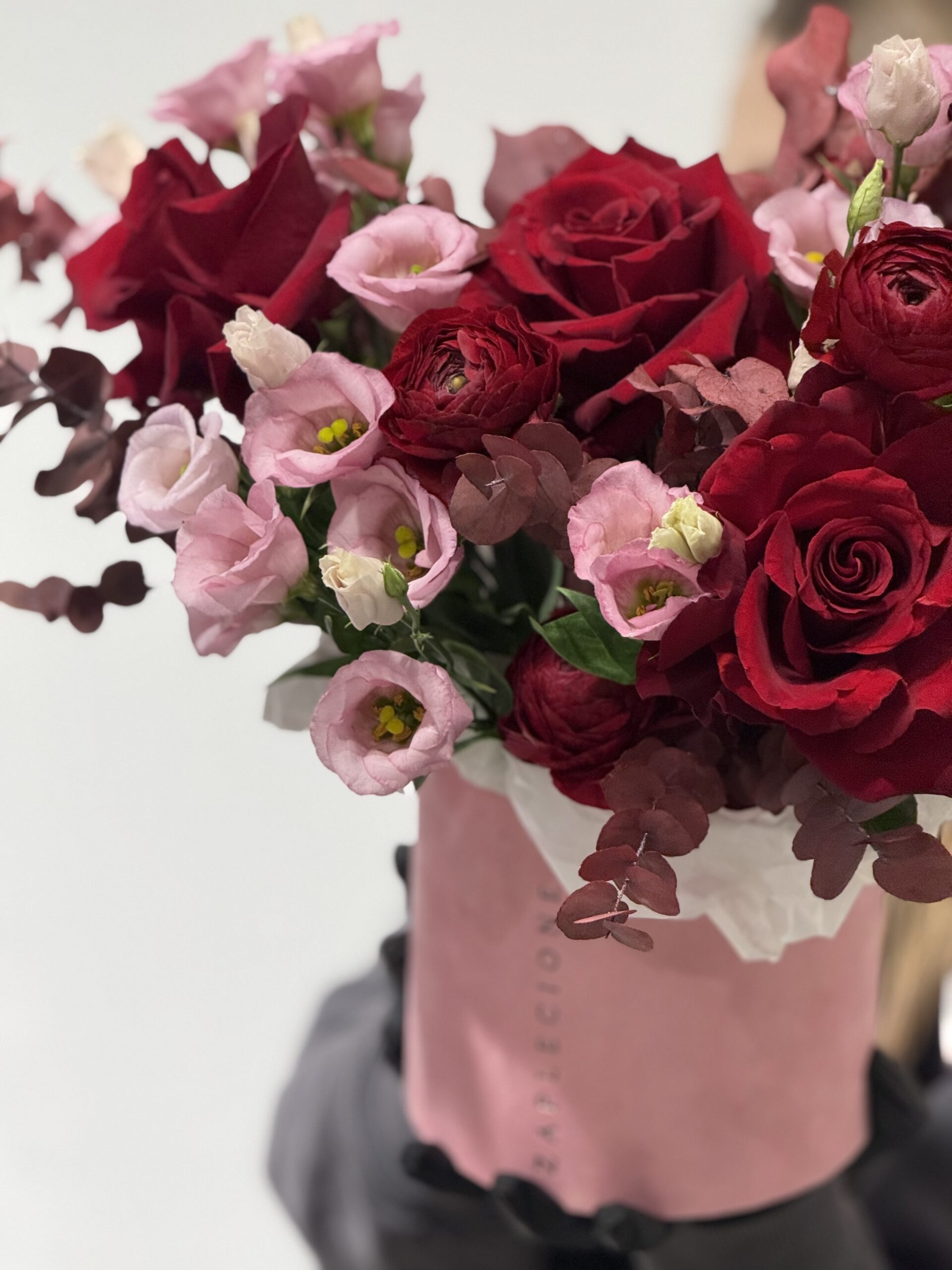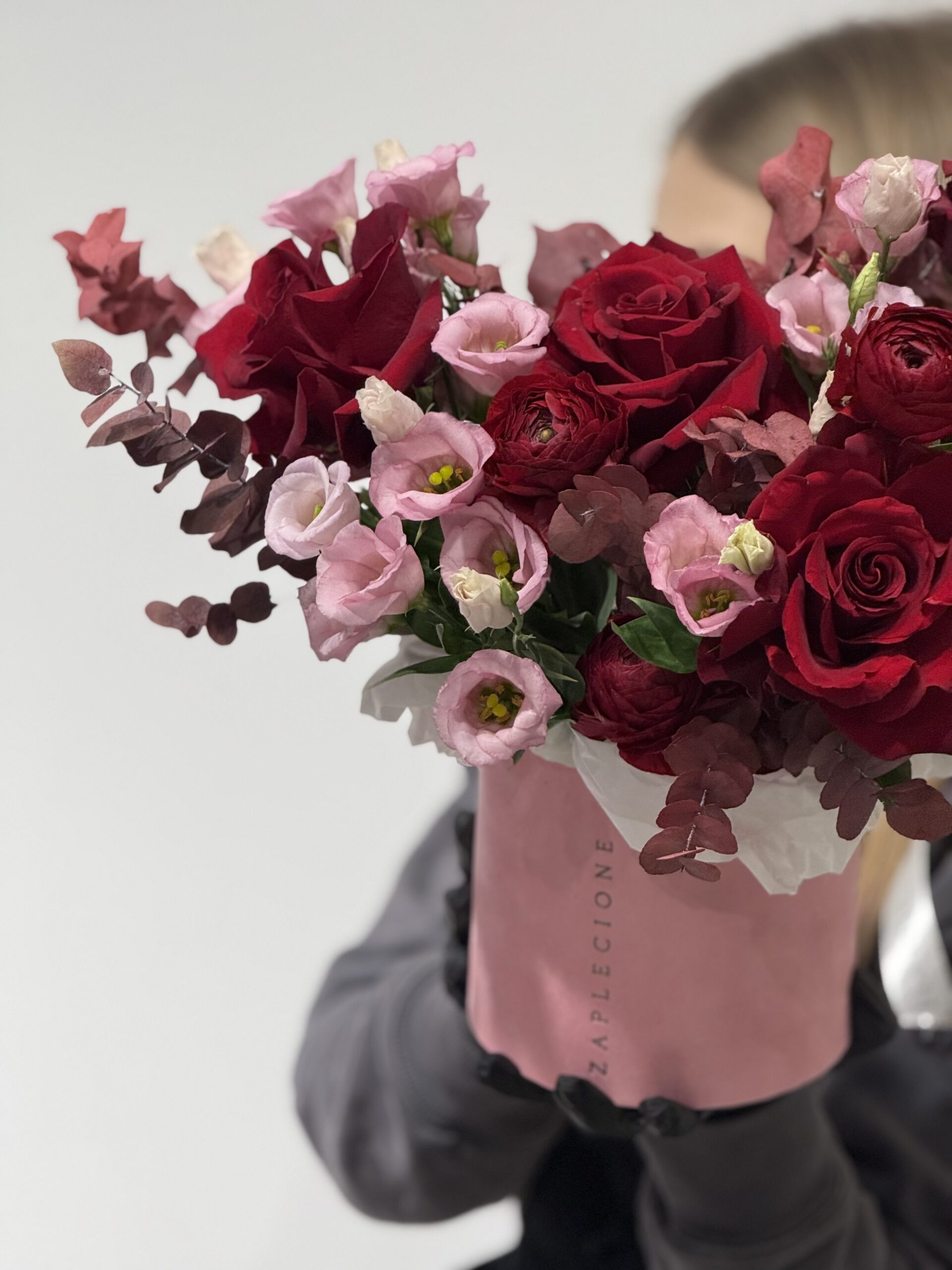 - Skład flowerboxa: róże czerwone, eustoma różowa, dekoracyjna zieleń.