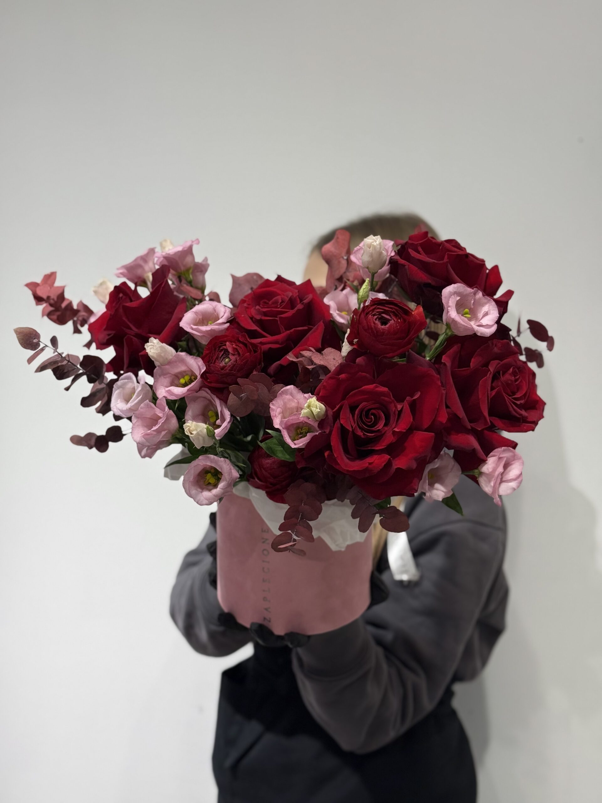 - Opakowanie: welurowy flowerbox, bibuła florystyczna, wstążka.