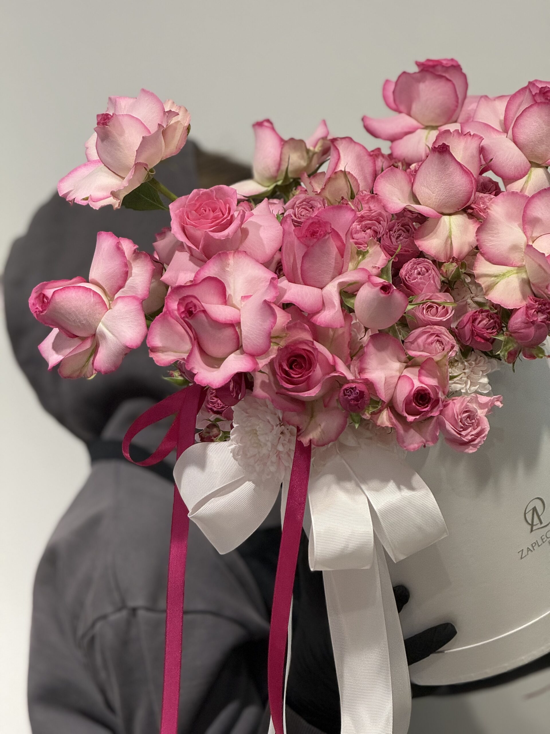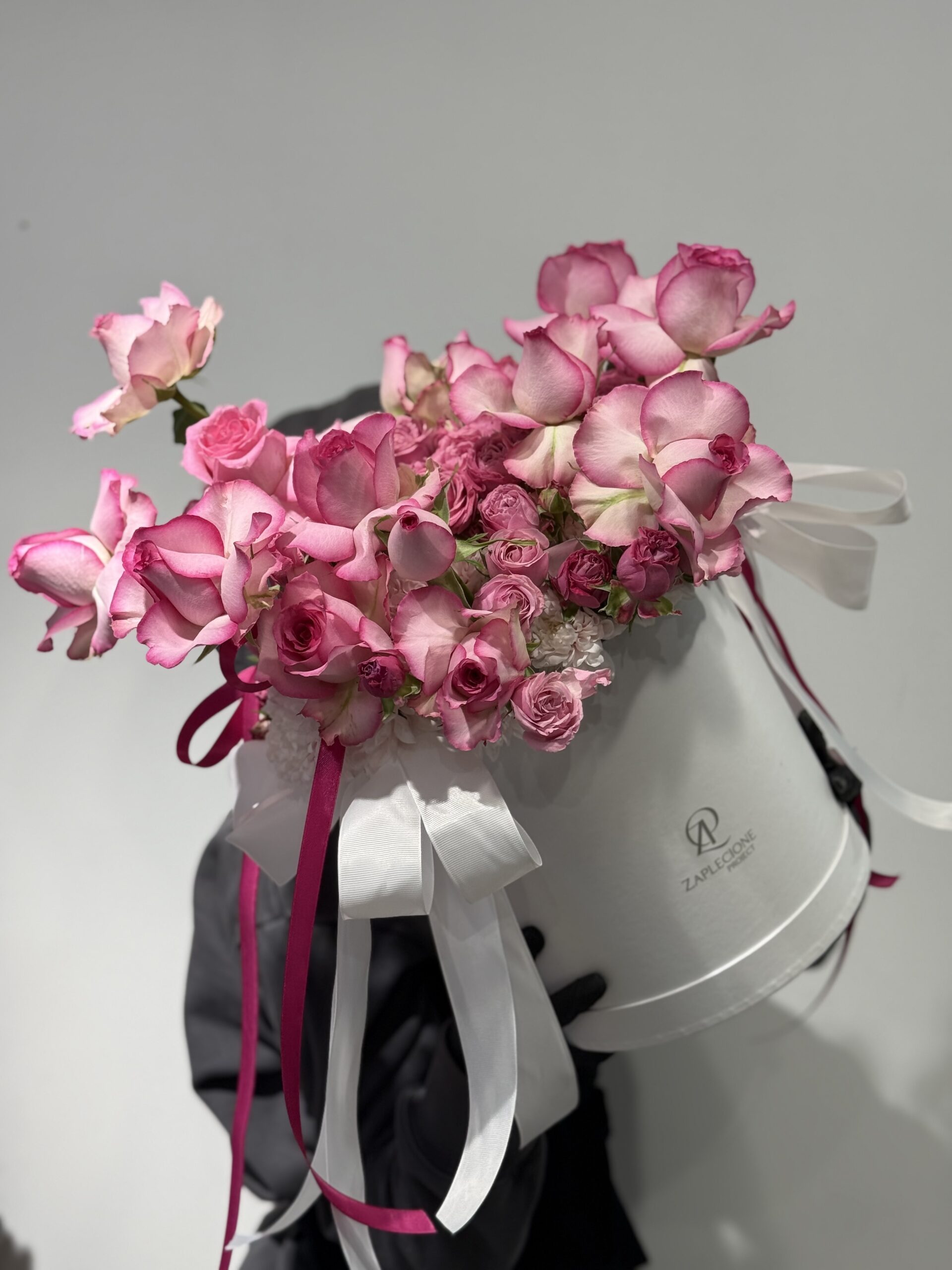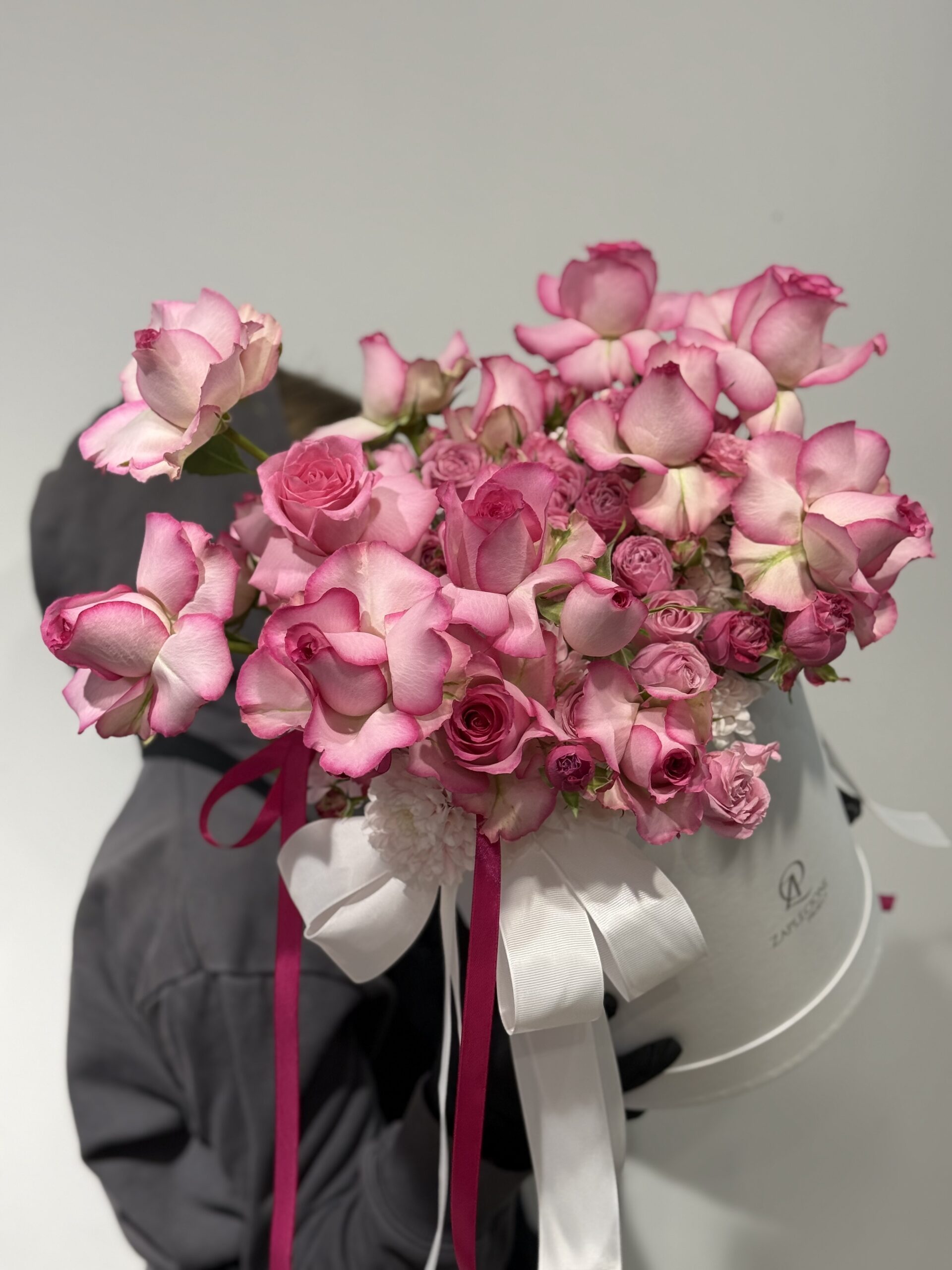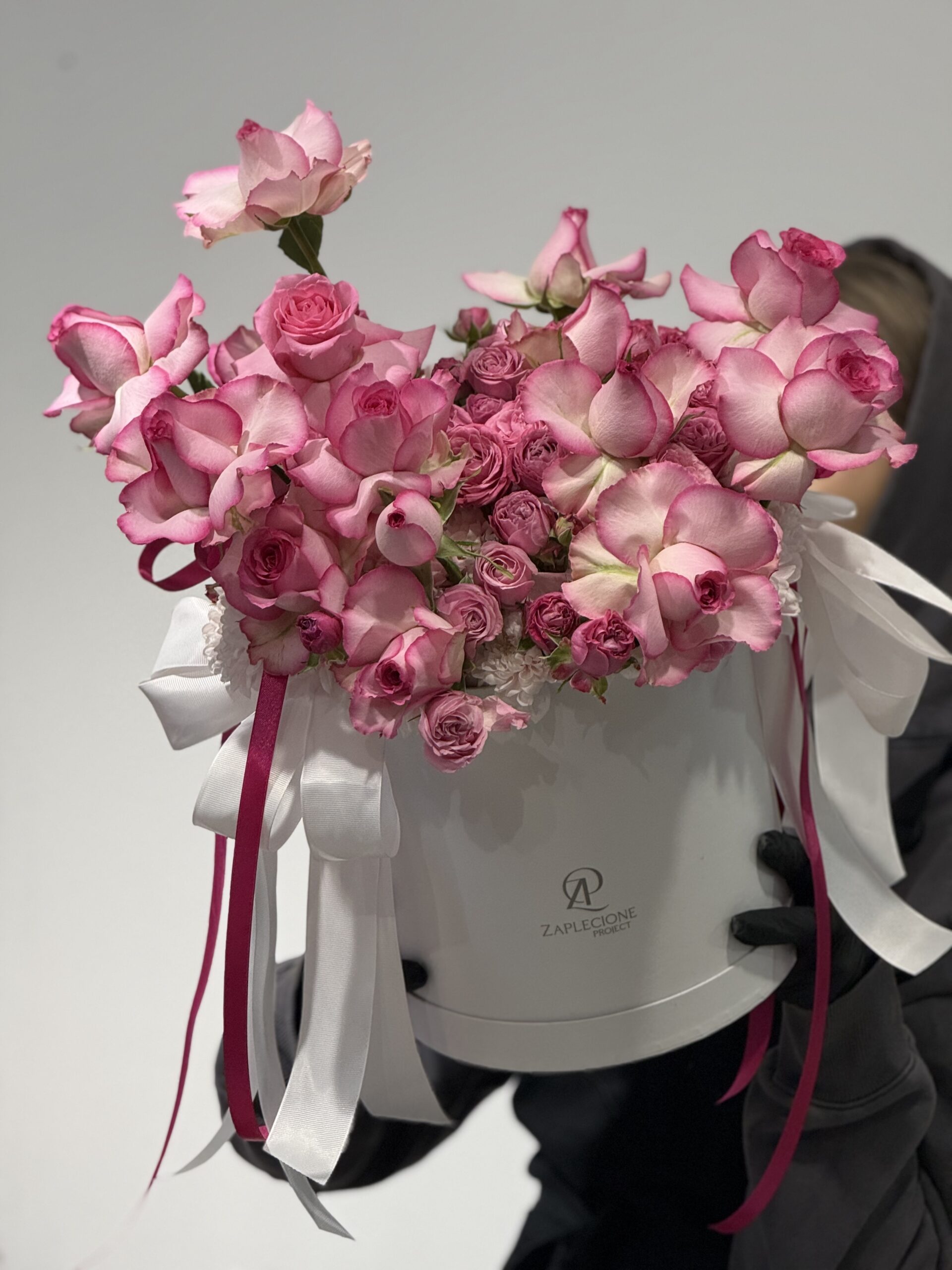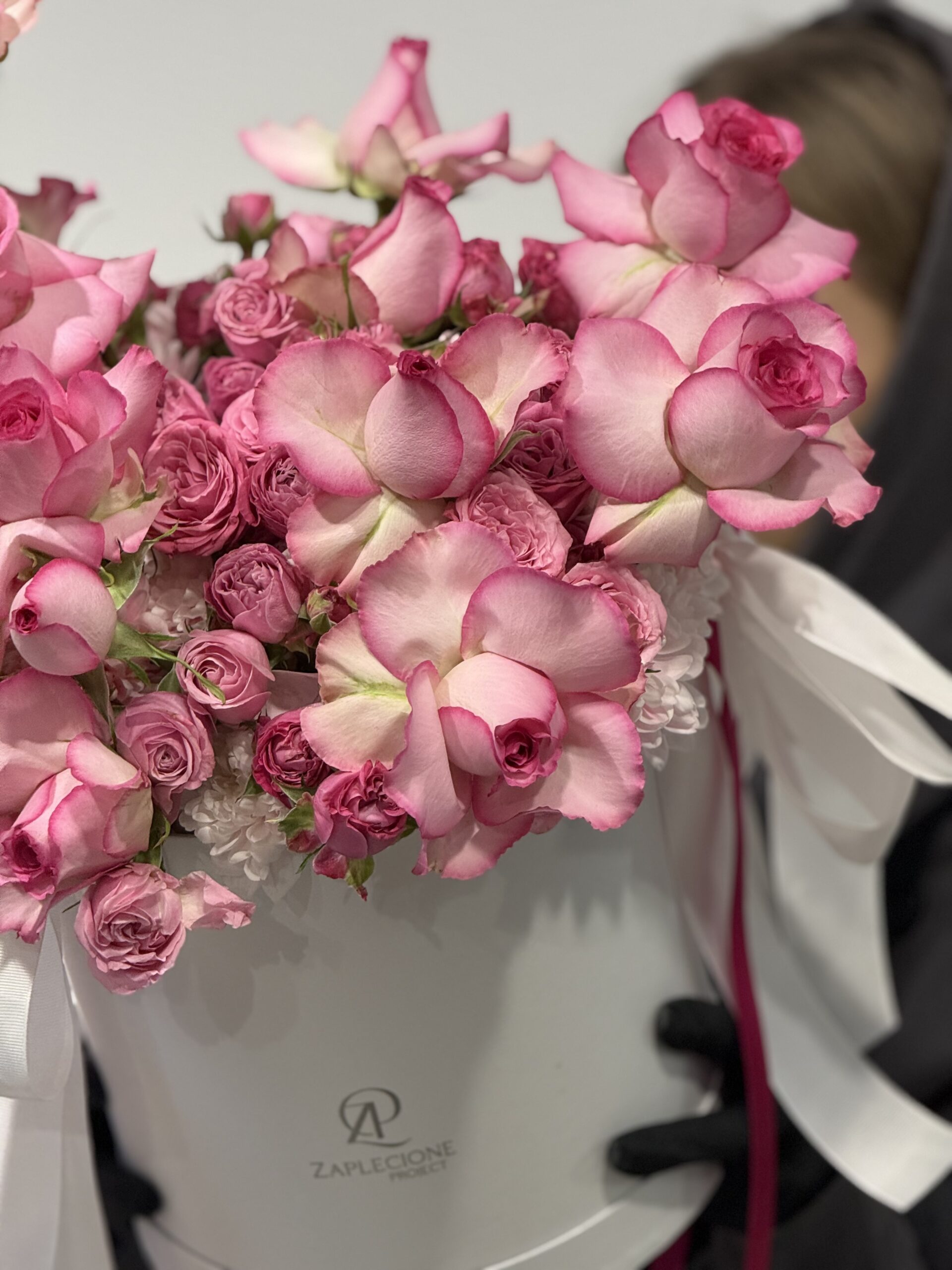 Flowerbox Pink Cloud to wyrafinowana i elegancka kompozycja kwiatowa, która zachwyci każdą obdarowaną osobę.Kompozycja na zdjęciu jest w rozmiarze Specjalnym