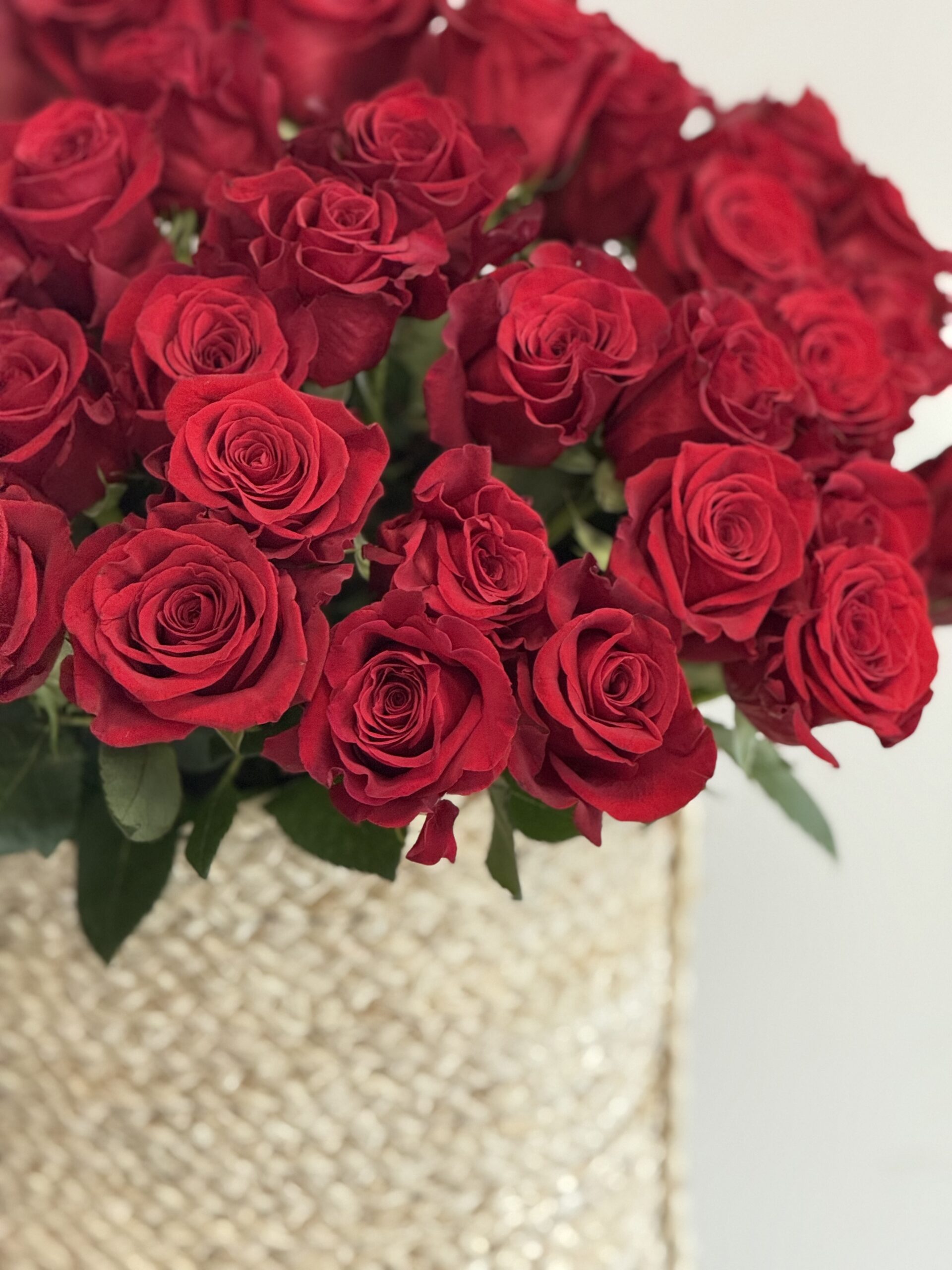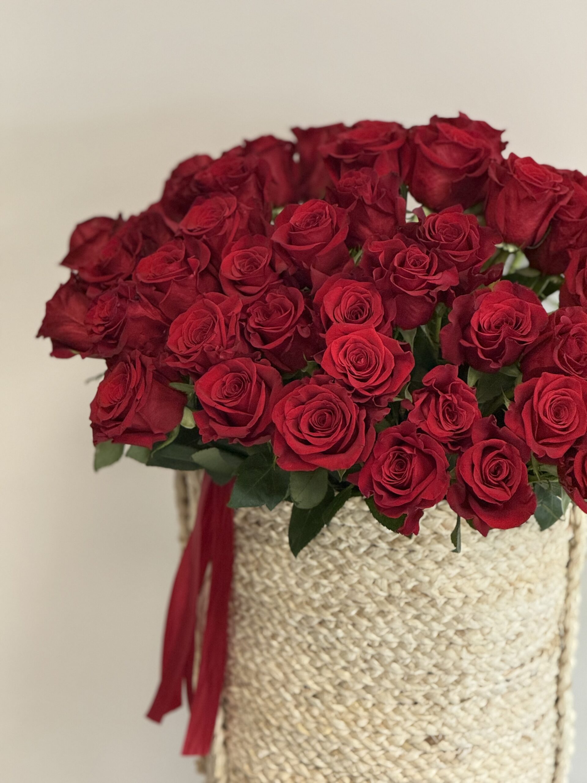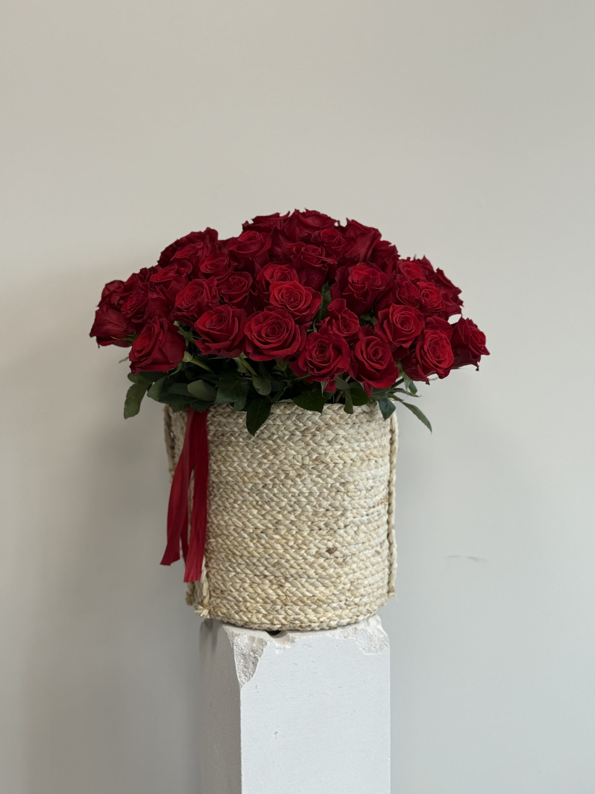 Kosz Czerwonych Róż to wyrazista, elegancka kompozycja w koszu,