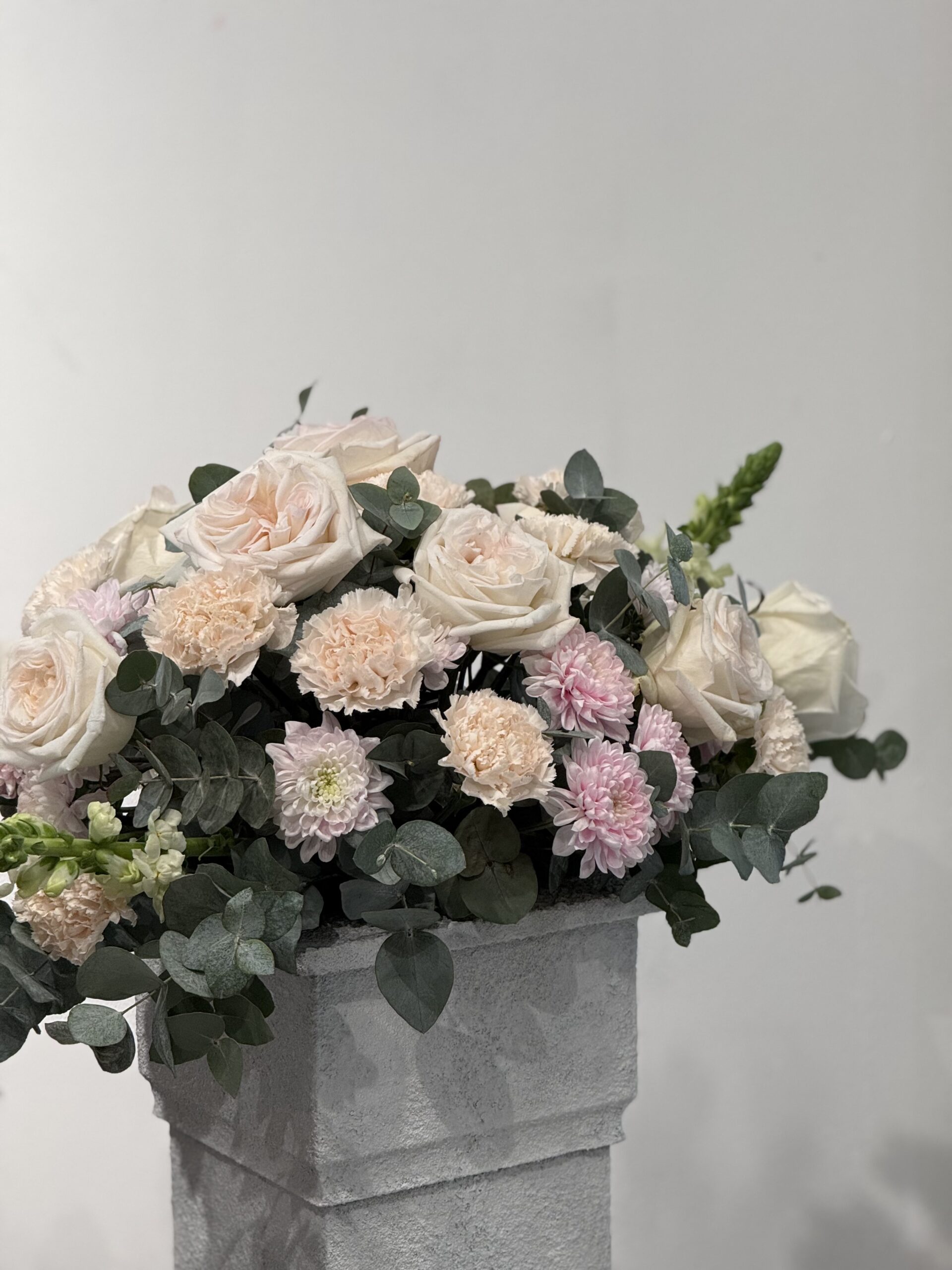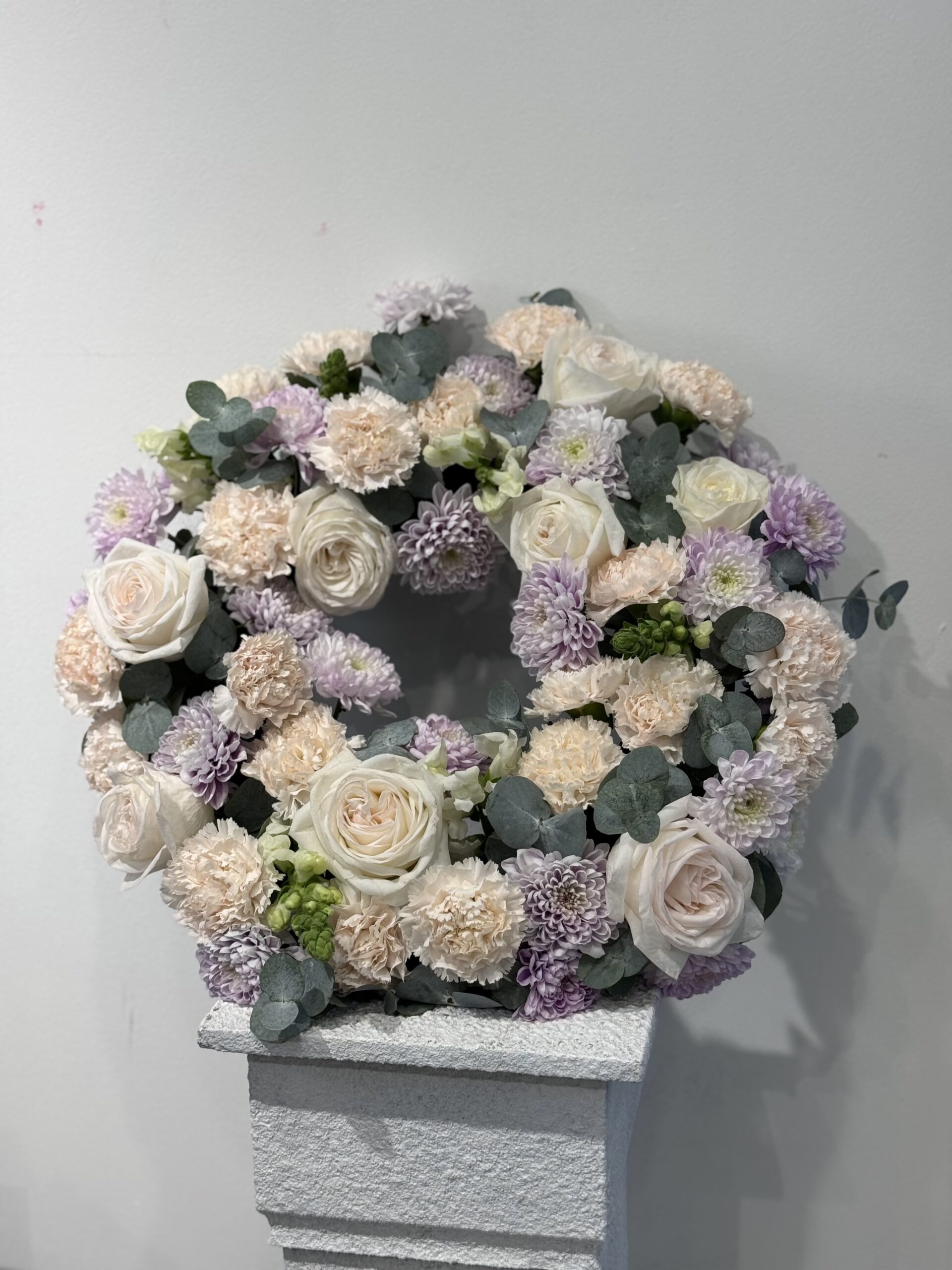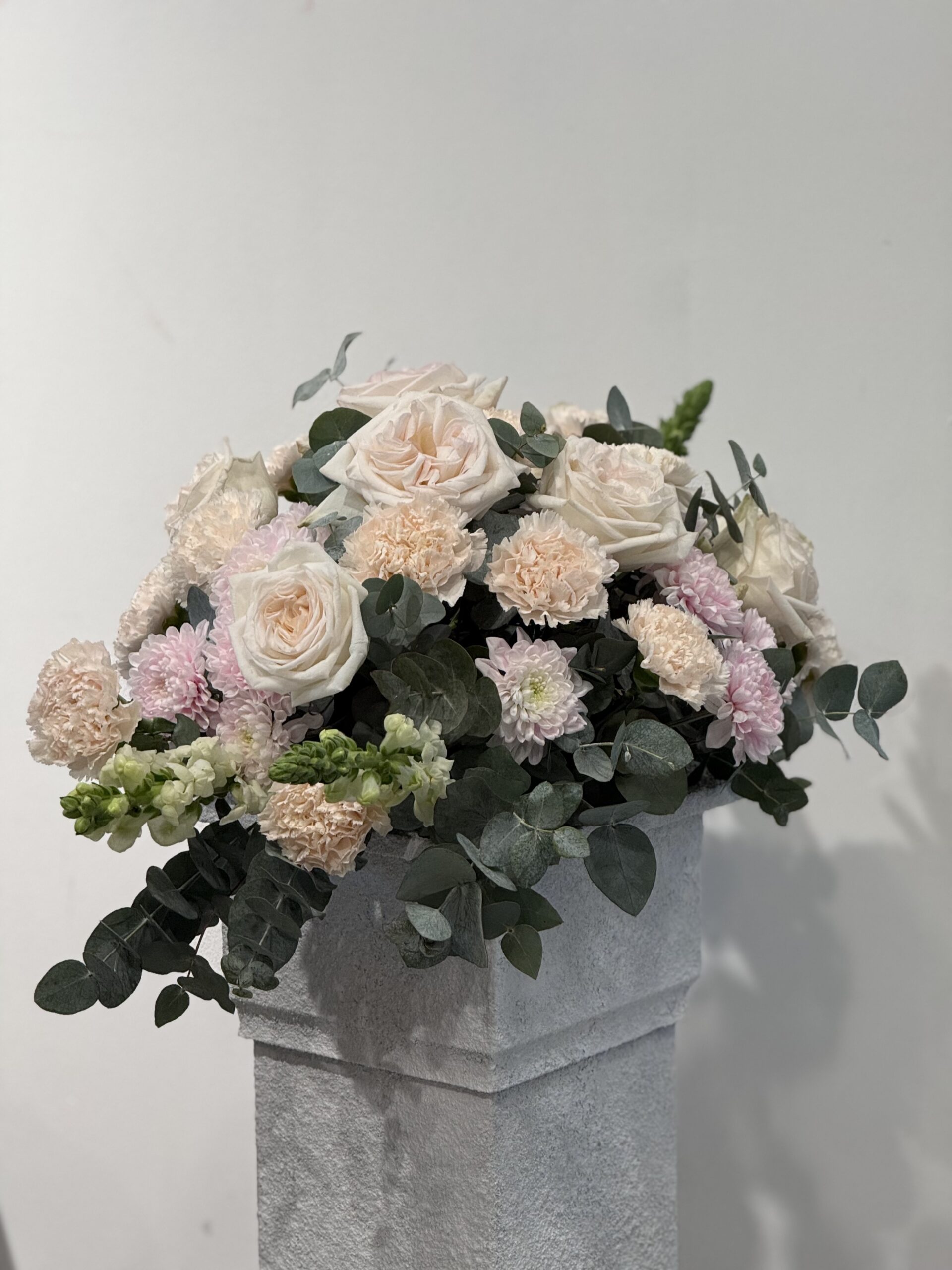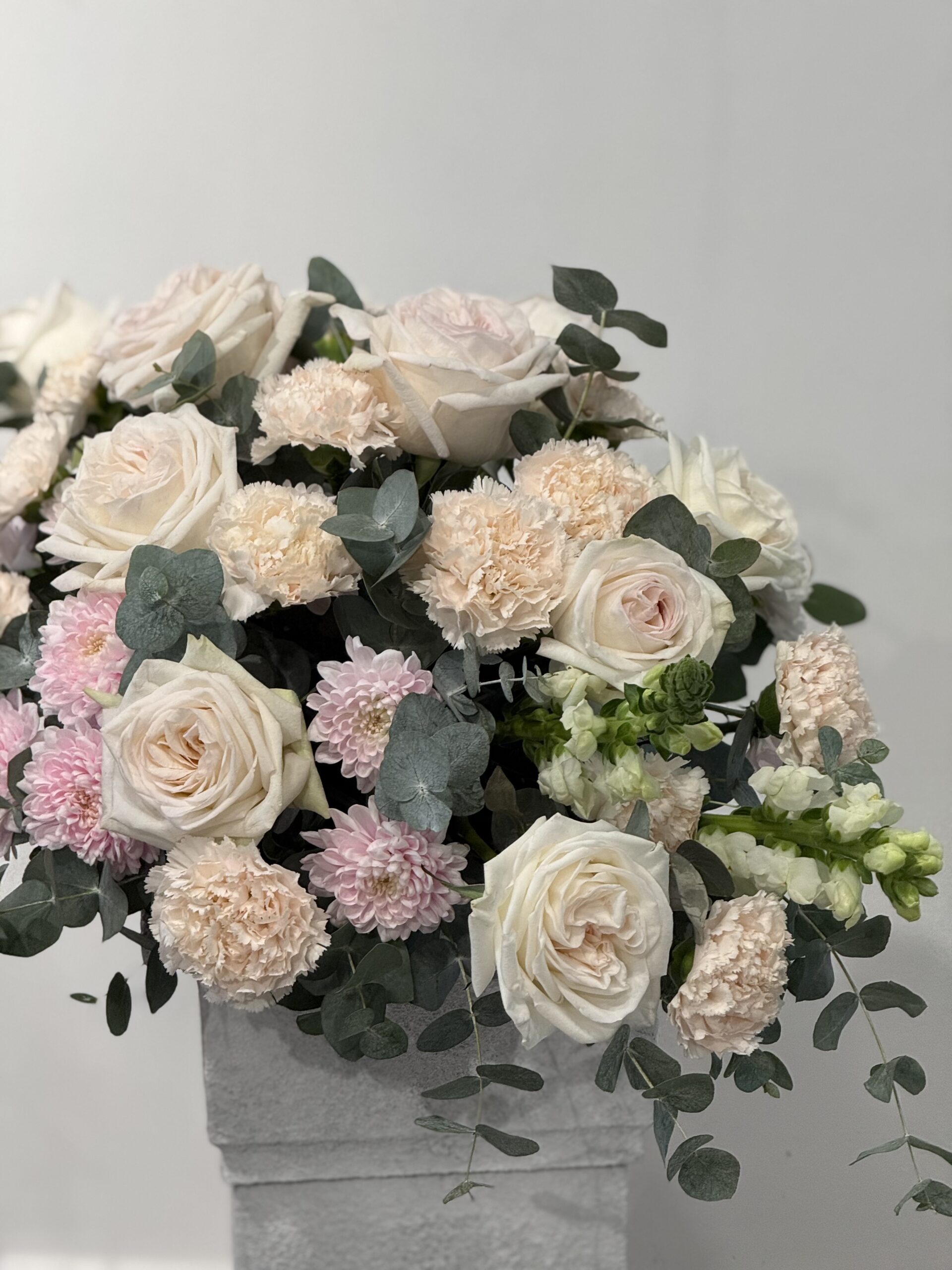 Elegancka i symboliczna wiązanka pogrzebowa wykonana na florecie. Kompozycja przygotowywana z dbałością